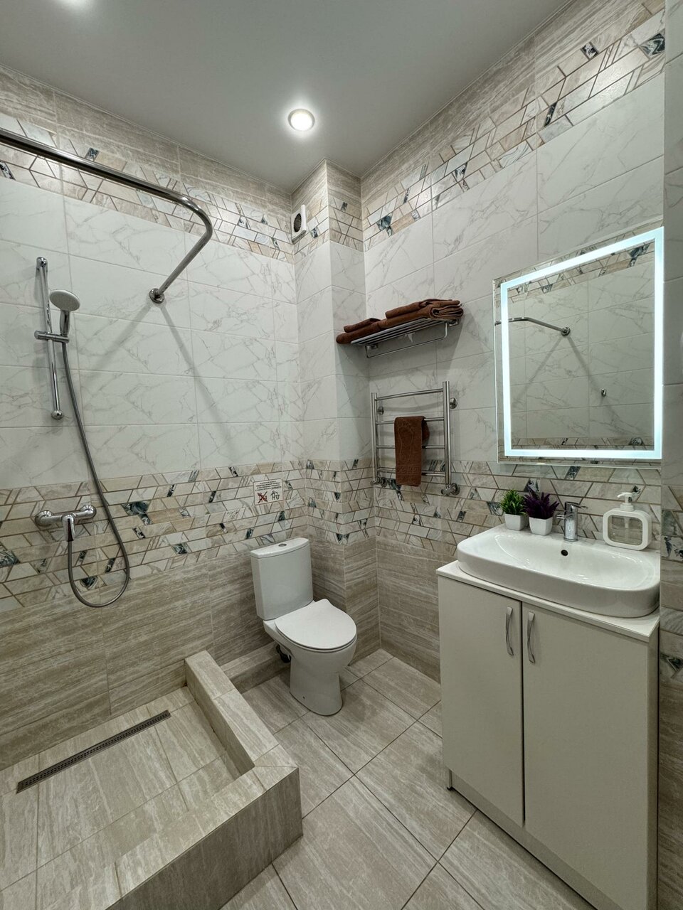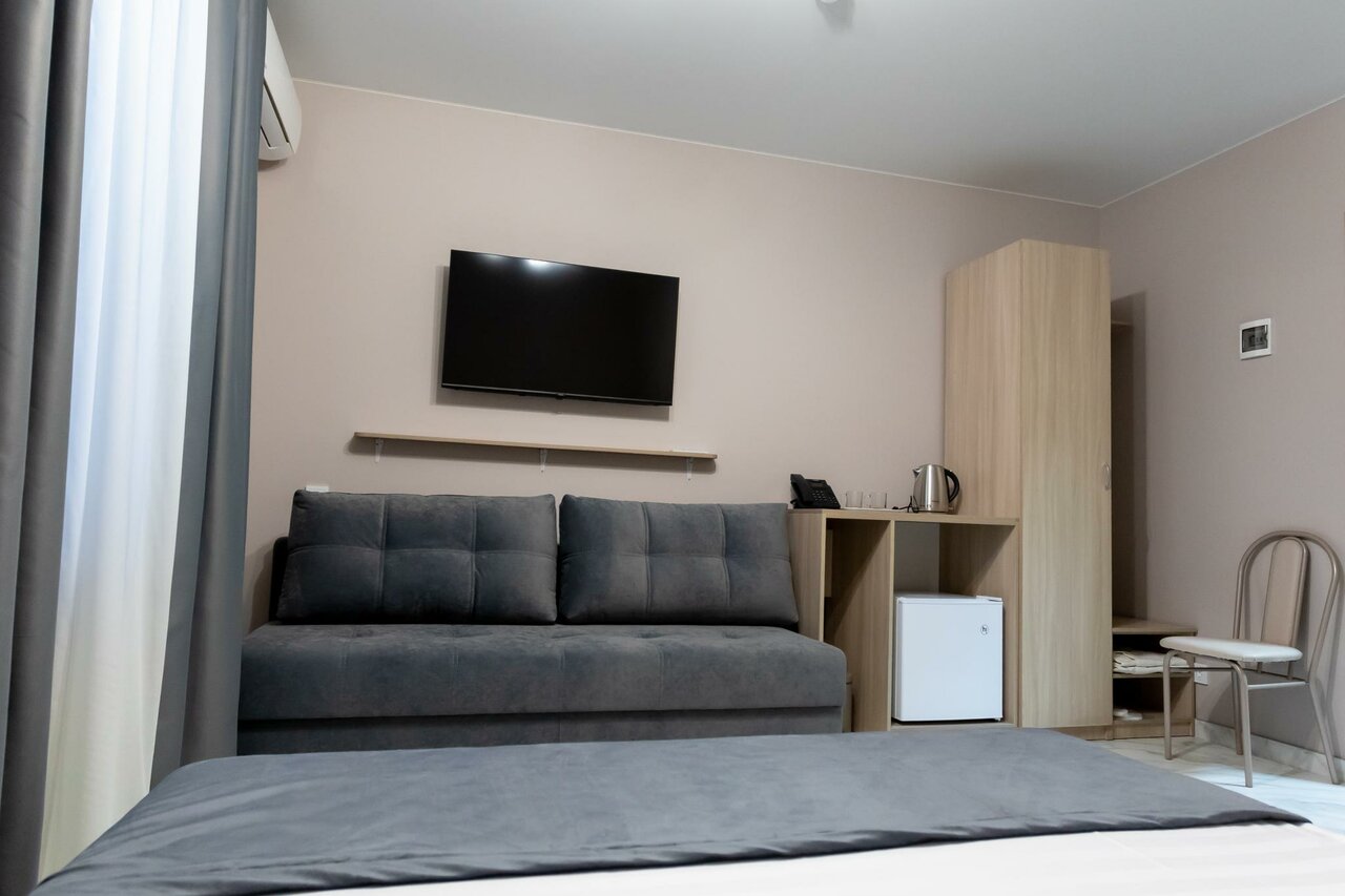 - Полная комплектация номера (кондиционер, посуда, холодильник, чайник, телевизор, тапочки, халаты).