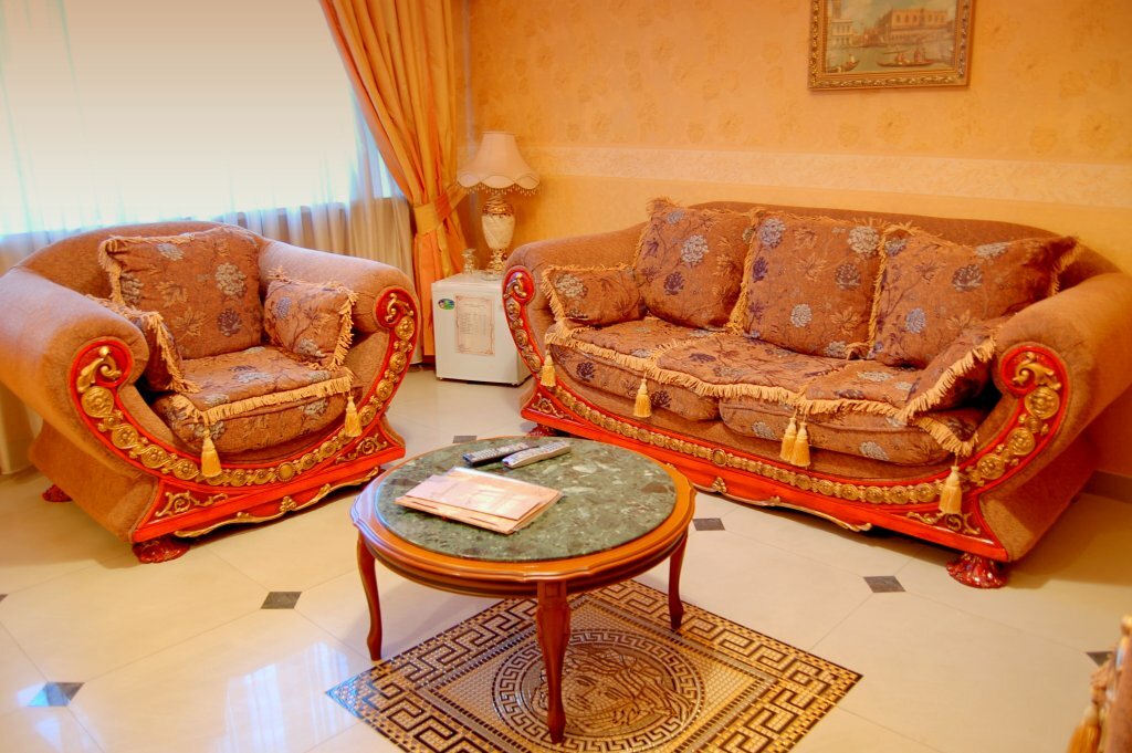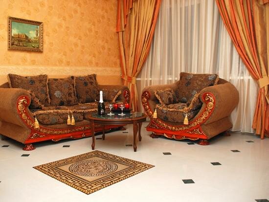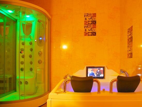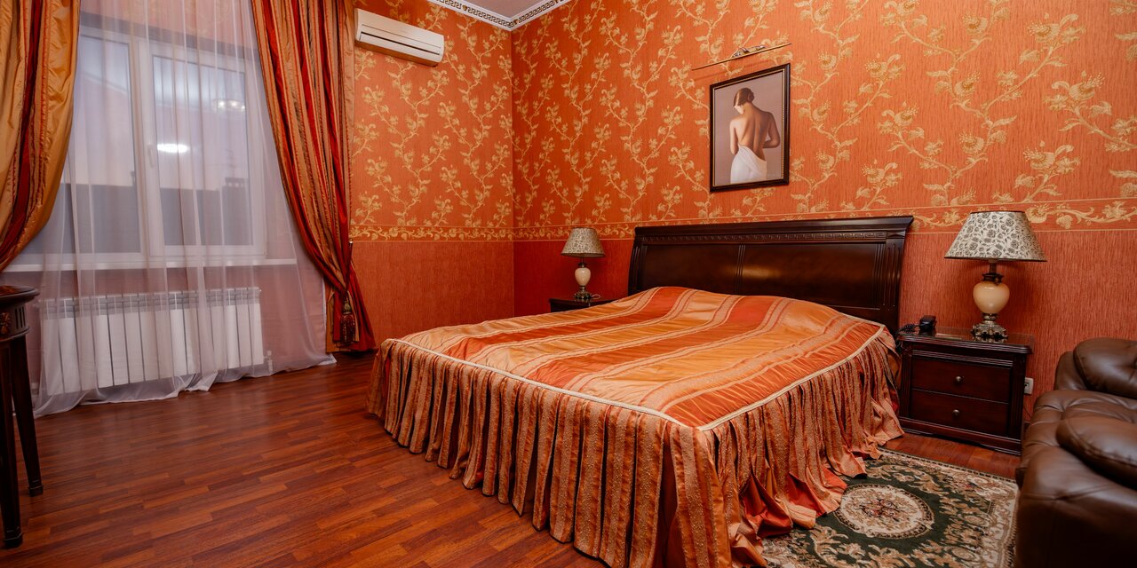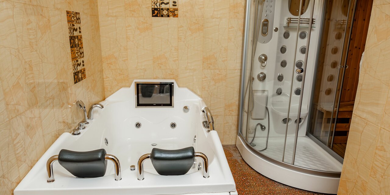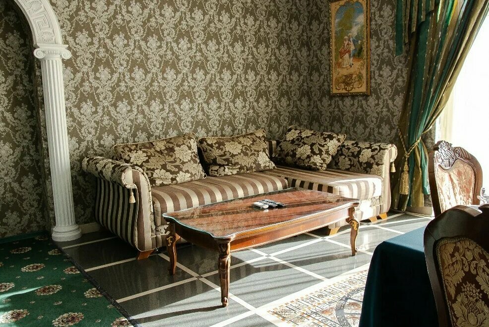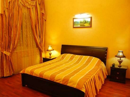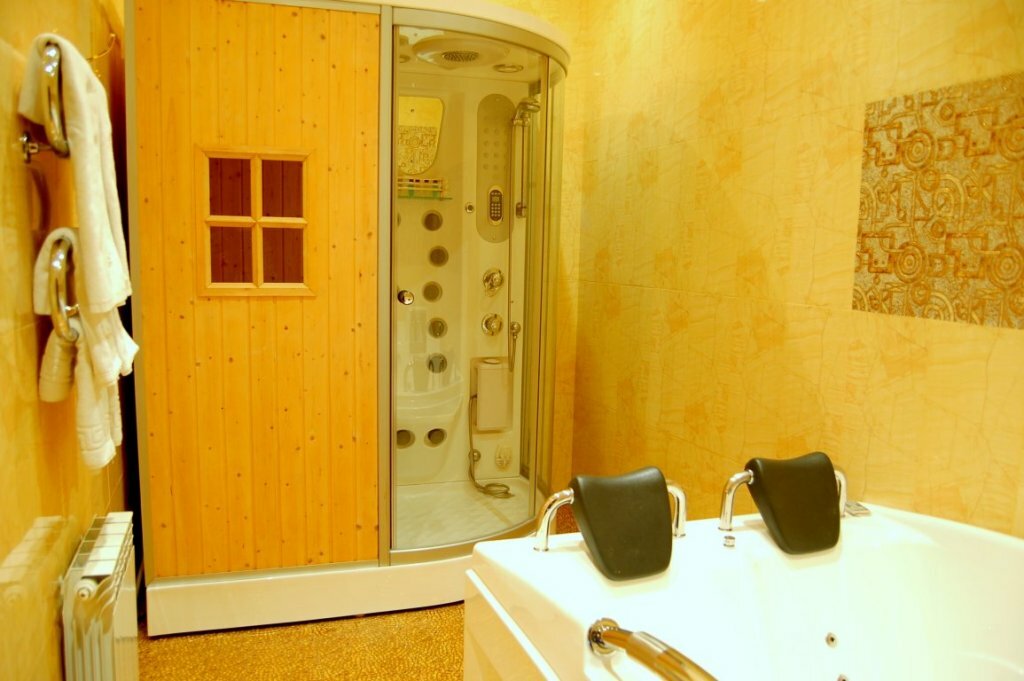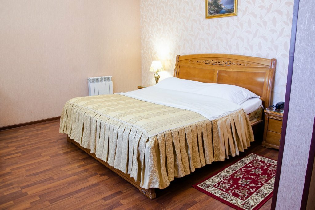 Номер категории «Люкс» включает в себя гостиную с мягкой мебелью, спальню с двухместной кроватью, ЖК телевизор со спутниковым телевидением, WI-Fi, телефон, сплит система, ванна с джакузи на две персоны, душевая кабина с сауной, санузел.