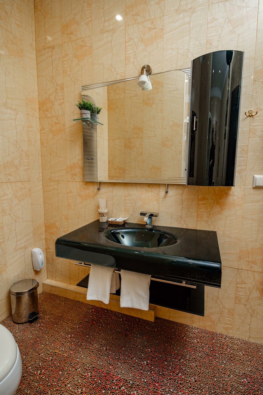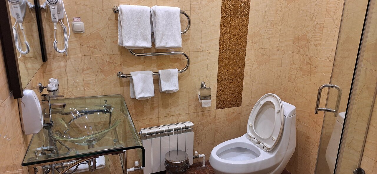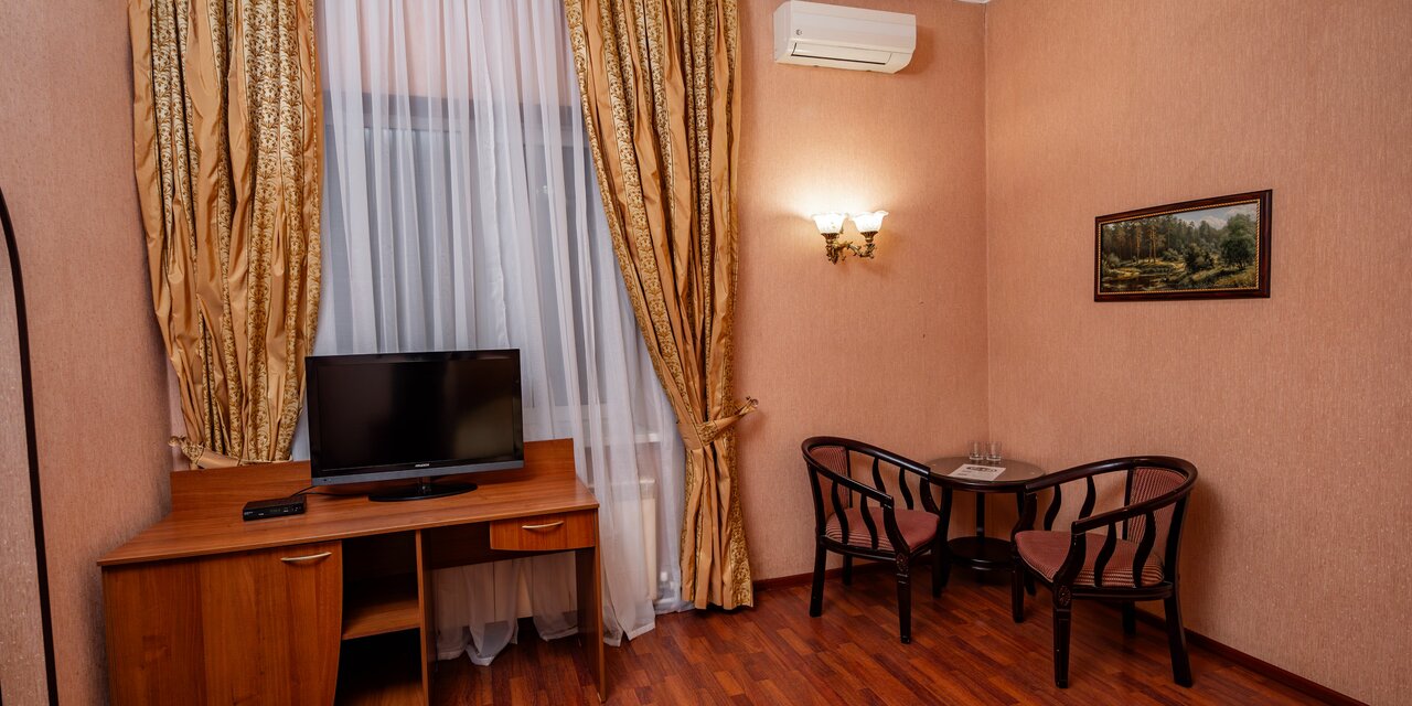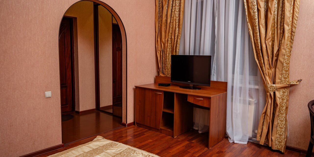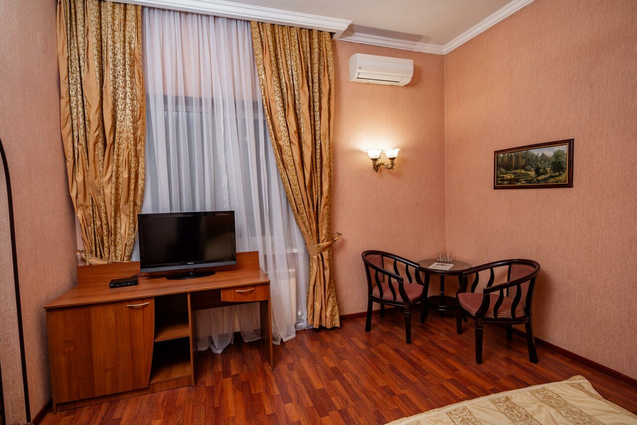 Номер категории «Стандарт» включает в себя двуспальную кровать, ЖК телевизор, WI-Fi, телефон, сплит-система, душевая кабина, санузел, туалетный столик, банные принадлежности, фен, тапочки.
