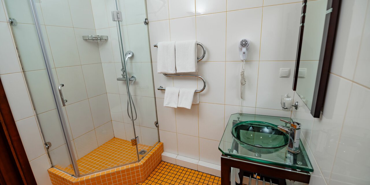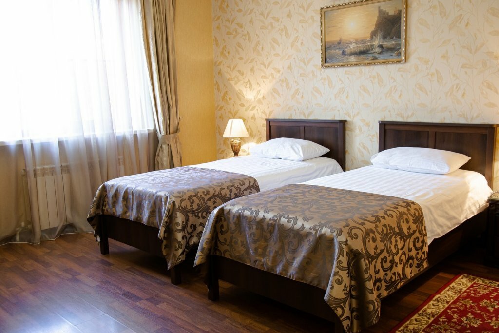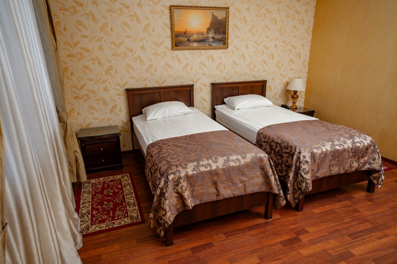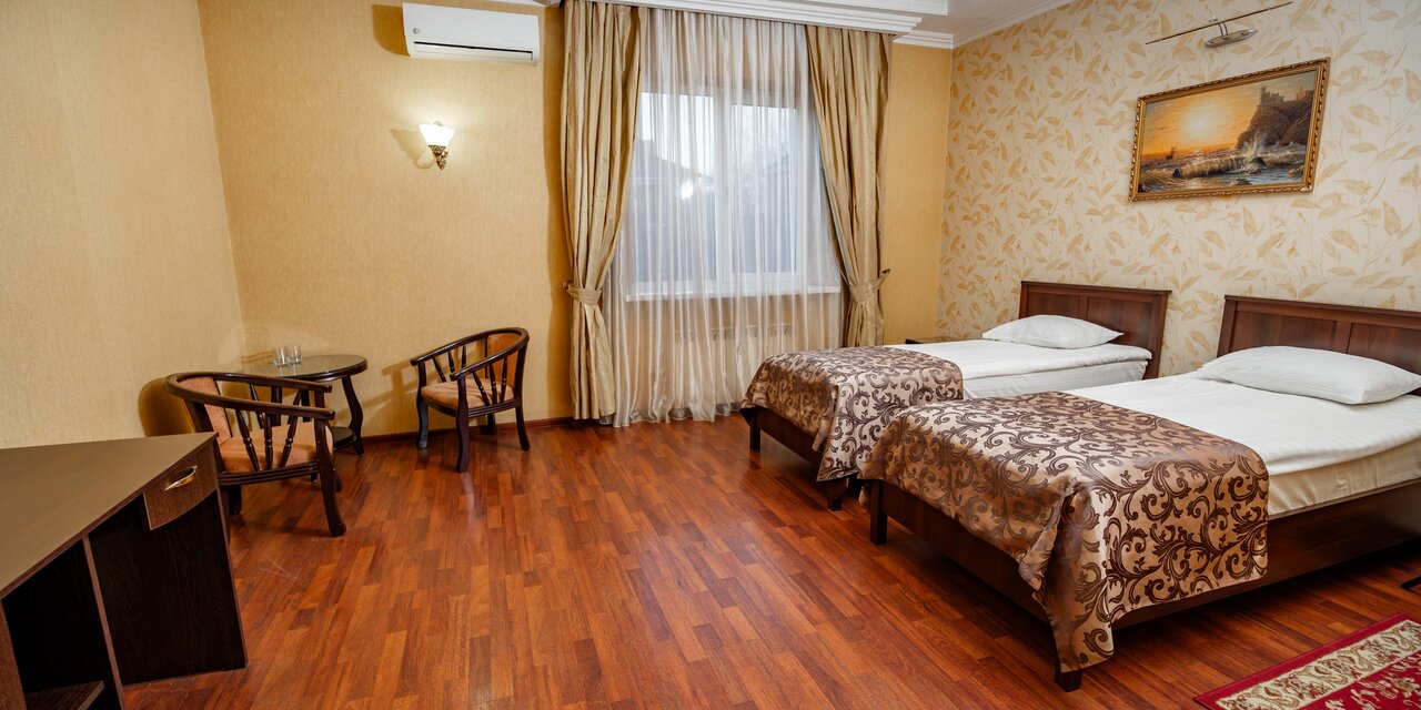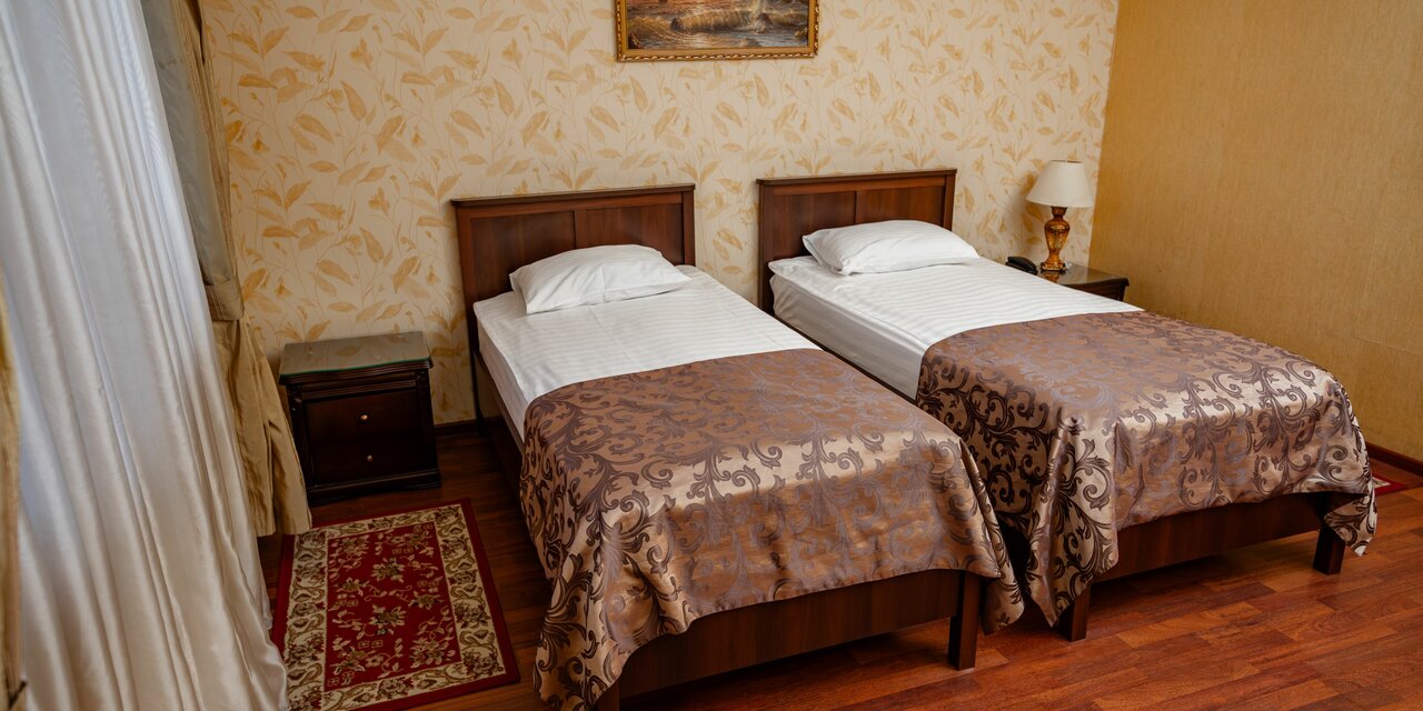 Двухместный номер категории «Стандарт - TWIN» Включает в себя две раздельные 1,5 кровати, ЖК телевизор, WI-Fi, телефон, сплит-система, душевая кабина, санузел, туалетный столик, банные принадлежности, фен, тапочки.