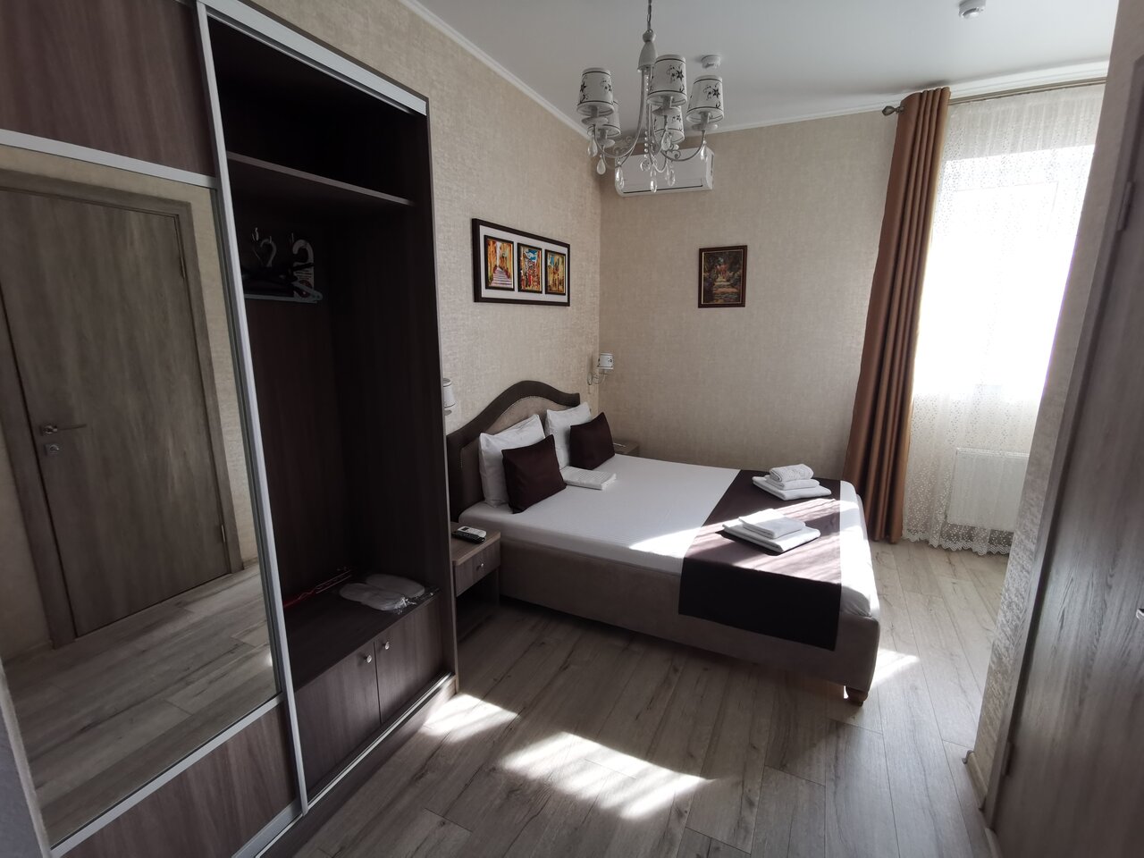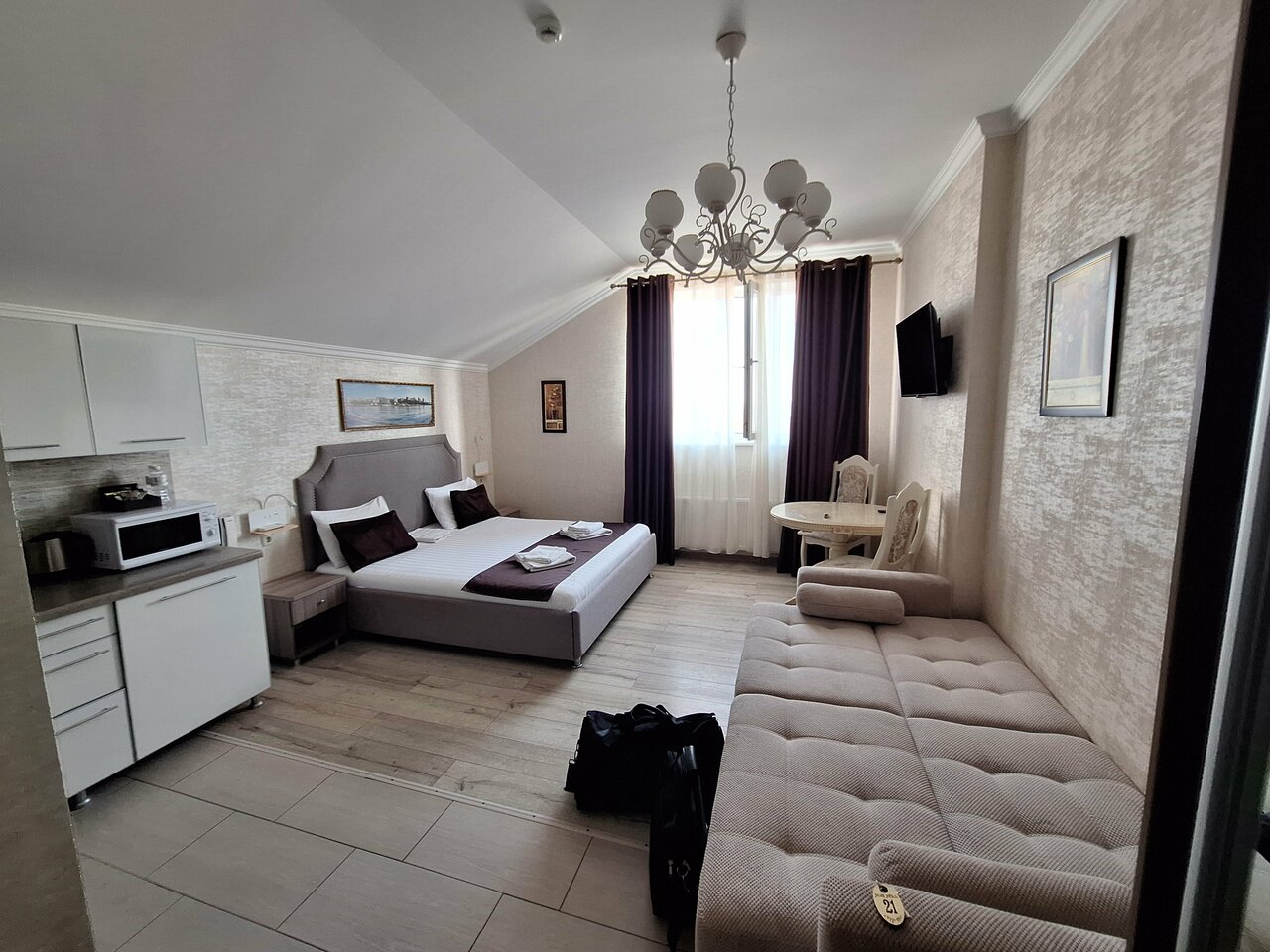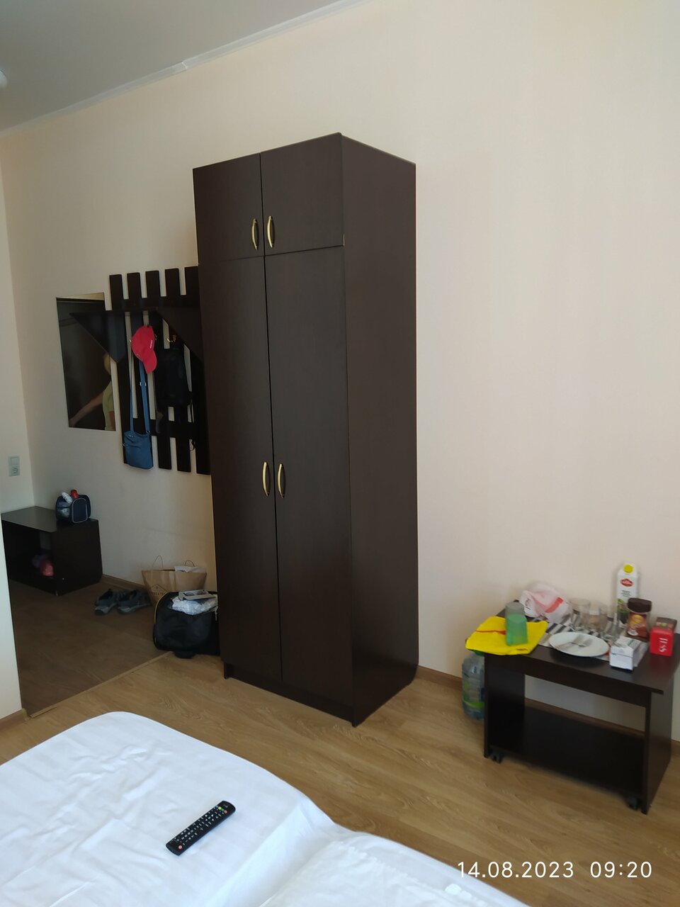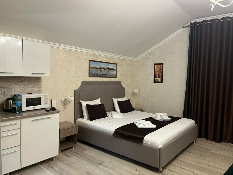 Шикарно остановились. Чистый номер, не прокурено что для нас очень важно. Хороший завтрак, приятный персонал, отдельно спасибо горничной Анжелике. Номер просторный, кровать и диван, мини кухня, есть чайник/микроволновка, даже сейф. Пакетики шампунь/гель, зубной набор, тапочки. Из минусов — атаковали комары, несмотря на москитную сетку, но в тумбочке были обнаружены три (!) фумигатора, в итоге комаров победили. На территории закрытая парковка. Гостиницу рекомендую.