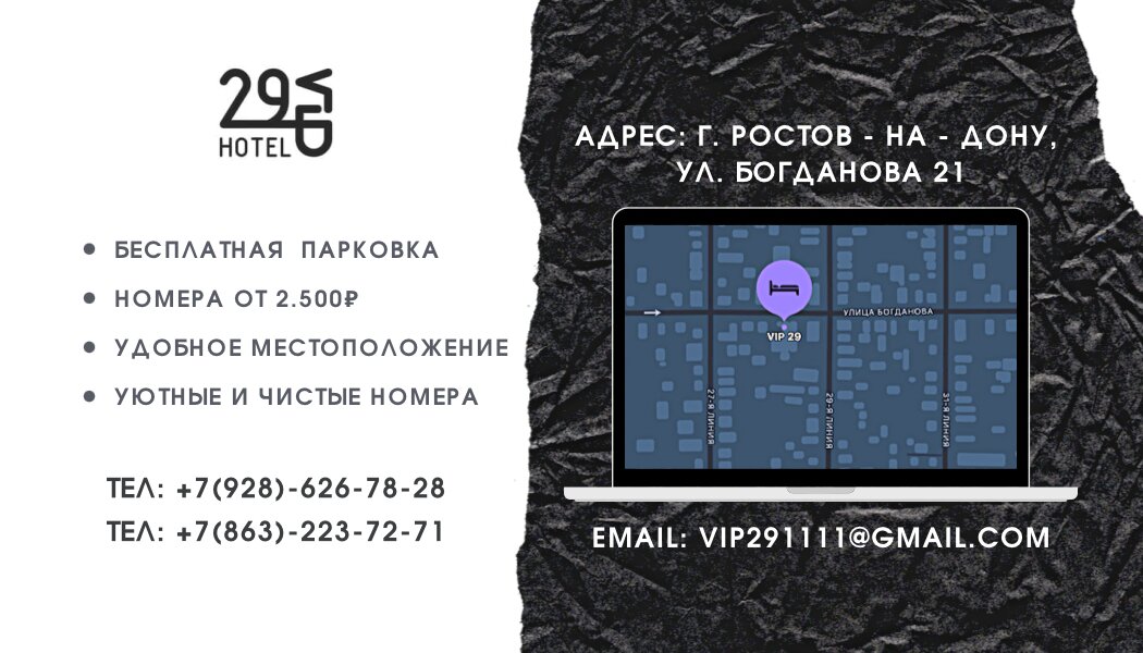 Контакты: +7 (863) 223-72-71, +7 (928) 626-78-28 Факс: +7 (863) 223-71-22 www.vip29hotel.ru