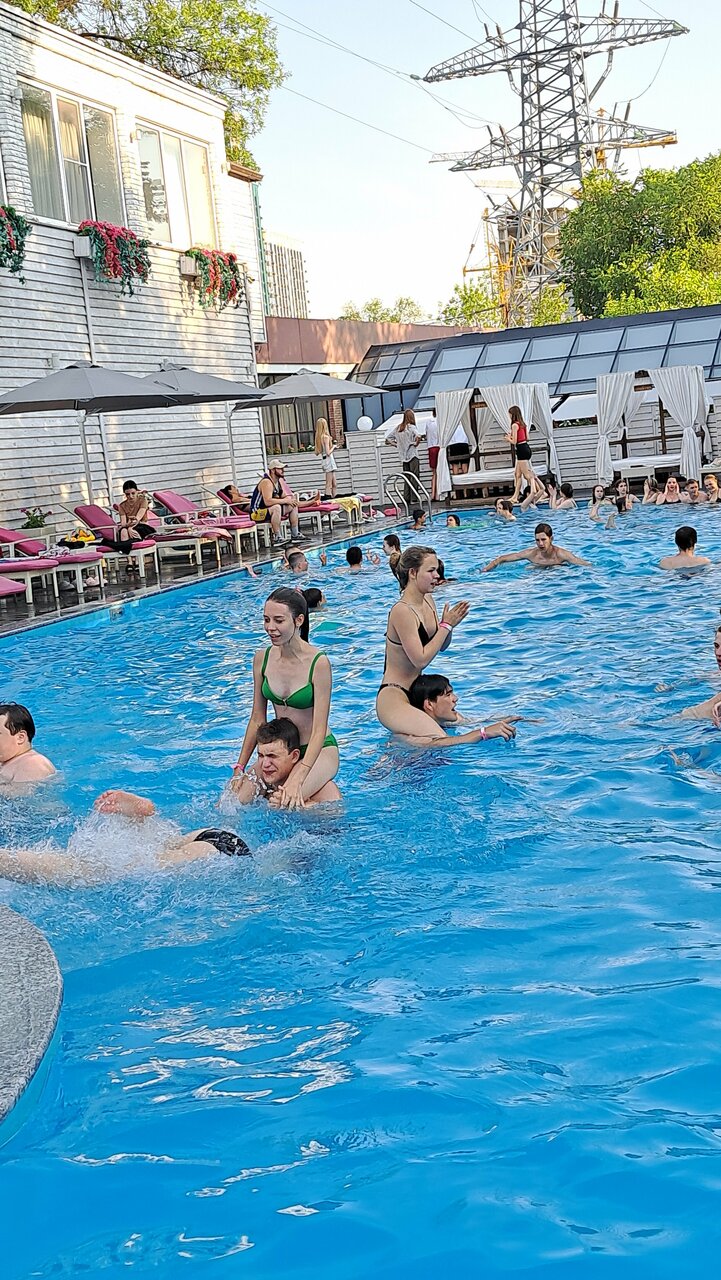 Арендовали второй этаж увидели бассейн, спустились ,окунулся, официант принс нам полотенца, и на бодриках пошли гулять дальше, персонал молодцы. Лично мне всё понравилось.