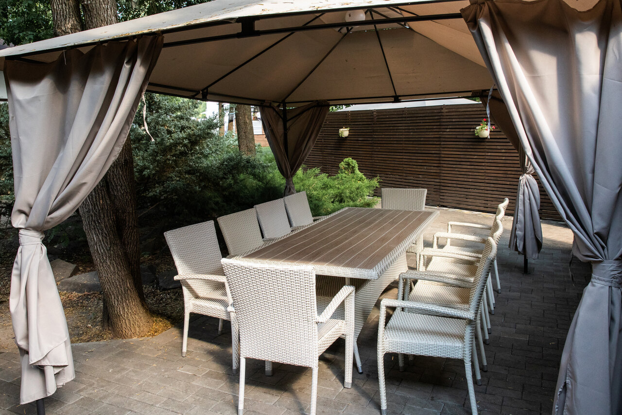 На территории клуба расположено 19 веранд разной вместимости, которые отлично подойдут для отдыха веселой компанией. В стоимость входит: веранда на ваше количество человек, холодильник, мангальная зона, бассейн с подогревом, детская площадка и др.