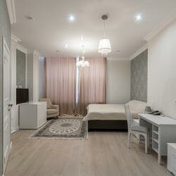 Удобства: — Круглосуточная стойка регистрации, лифт, камера хранения — Завтрак, чай/кофе в номерах — Фен, халаты, тапочки, утюг — Прачечная, уборка, сейф