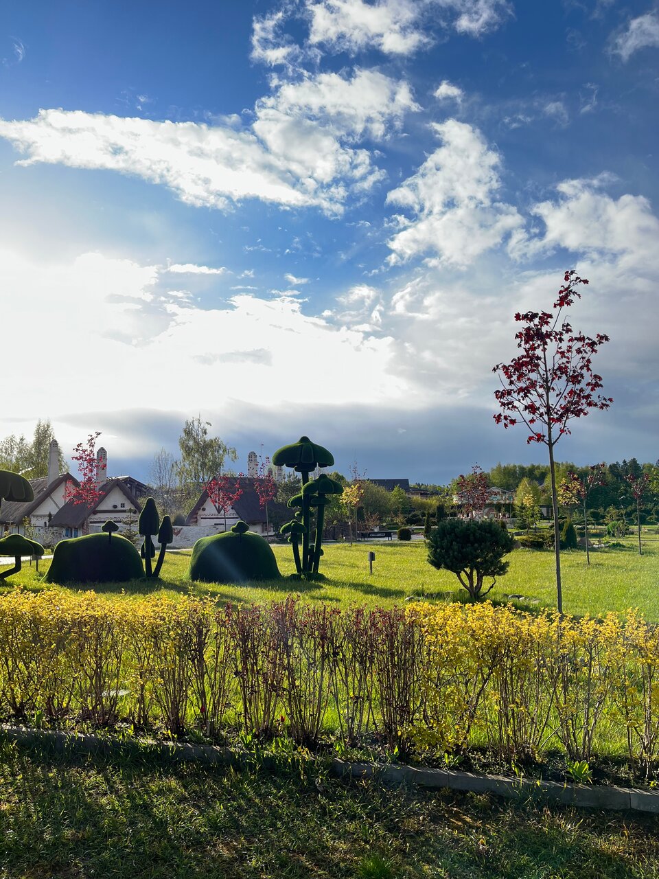 - Большая территория с развлечениями (зоопарк, детская площадка, топиарии).