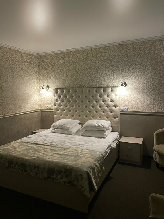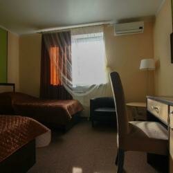 Двухместный номер повышенной комфортности. Двуспальная кровать, письменный стол, телевизор с плоским экраном, холодильник, кондиционер, телефон, Wi-Fi , собственный туалет и душ, электрический чайник, фен, средства личной гигиены, тапочки, доставка б