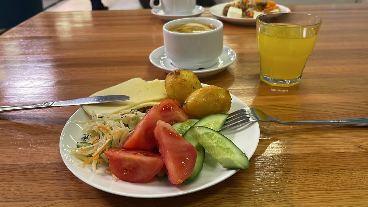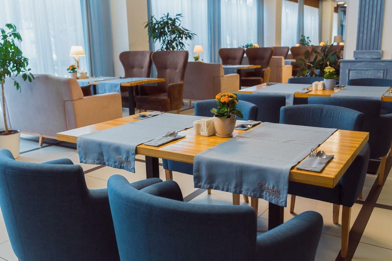 Хорошая гостиница, очень шикарные завтраки, тематический ресторан ‘Есенин’, но все же небольшие недочёты в работе кухни при обслуживании команды были