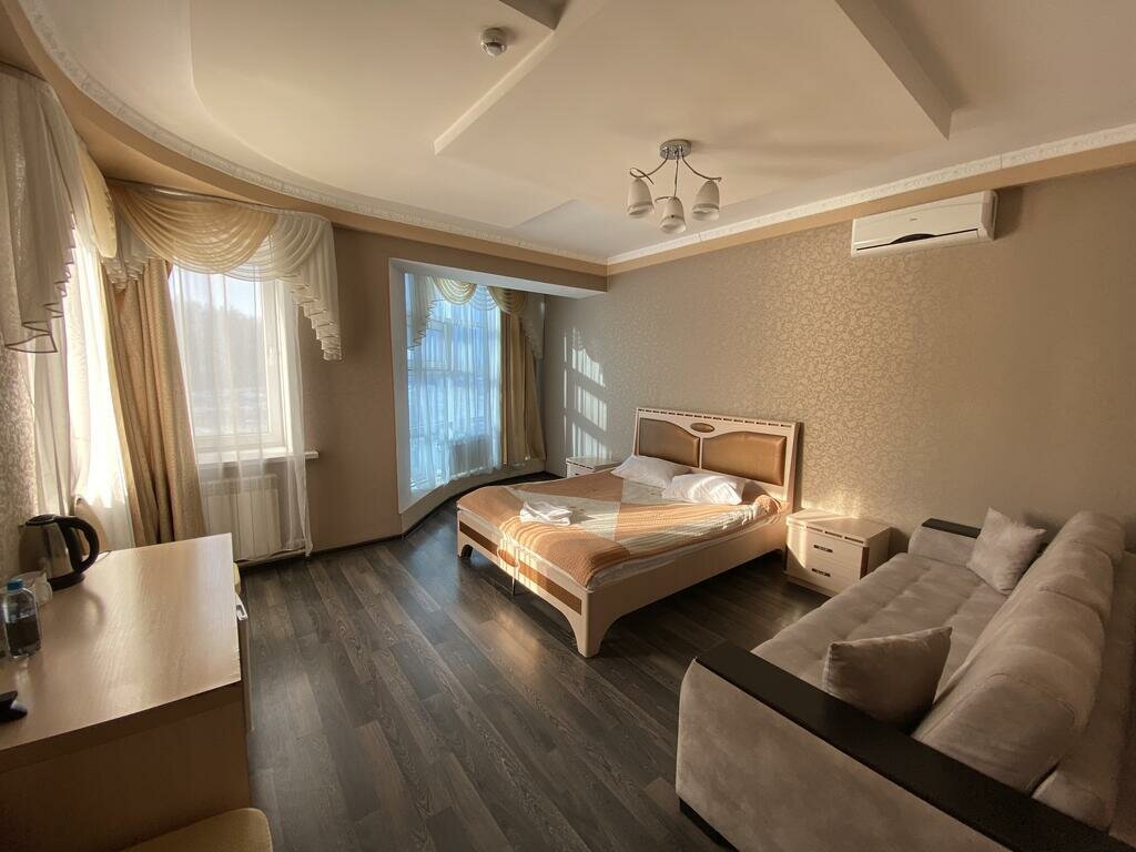 Снимала номер 206 люкс , но сказать что это люкс я не могу. Номер грязный, обои отвалились, ламинат в ужастном состоянии. В номере была кровать и диван, диван в таких пятнах, что даже страшно положить дамскую сумку. Номер конечно выходит во двор, но всю ночь машины, крики и т. д. Из плюсов в номере есть тапочки, одно полотенце, шампунь и зубной набор. Сеток на окнах нет ( комары одалели). Кровать еле дышит, матрас рваный и весь в пятнах. Завтрак в принципе не плохой и даже на выбор.