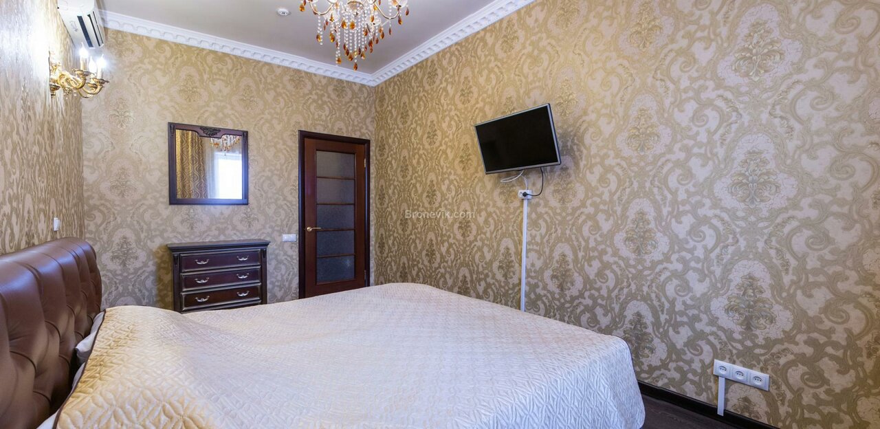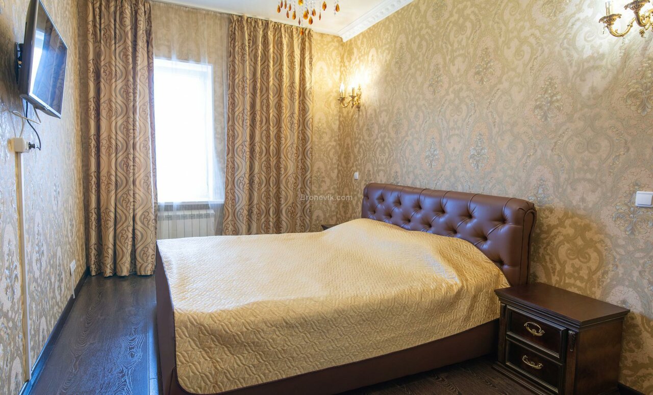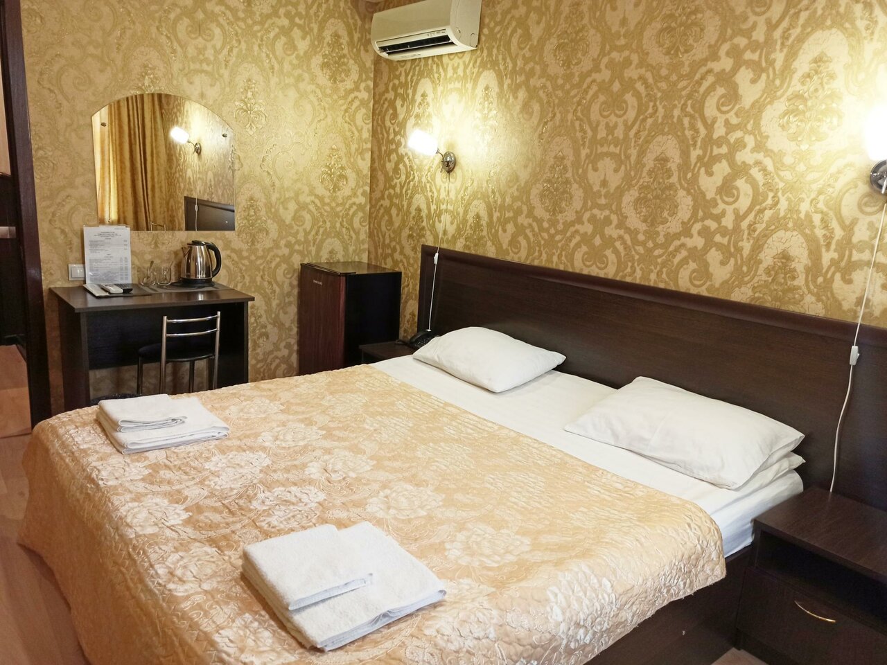 Однокомнатный номер с двуспальной кроватью. В номере стол, чайная станция, 2 стула, плазм.телевизор, кондиционер, холодильник, зона прихожей, шкаф для одежды, ванная комната с гидромассажной ванной и биде, халаты, тапочки.