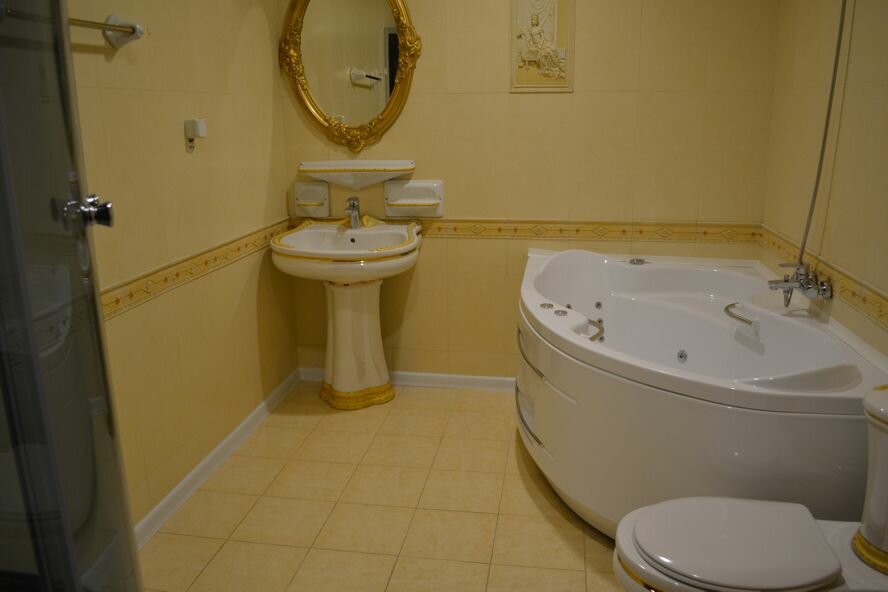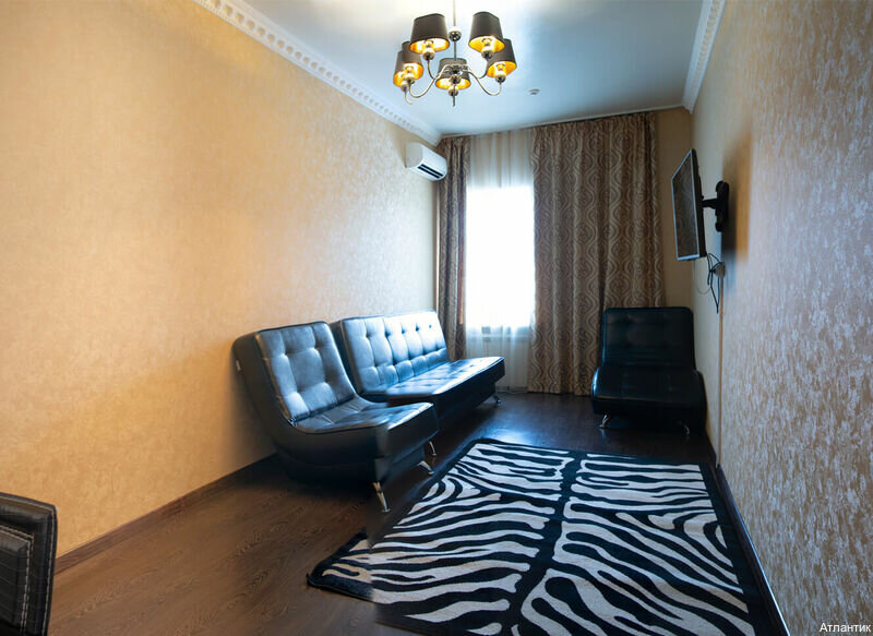 Двухкомнатный номер с двусп. кроватью и раскладным двусп. диваном. В номере 2 плазм.телевизора, холодильник, 2 кондиционера, обеденная зона, чайная станция, шкаф, ванная комната с гидромассажной ванной или душевой кабиной, биде, халаты, тапочки, фен.