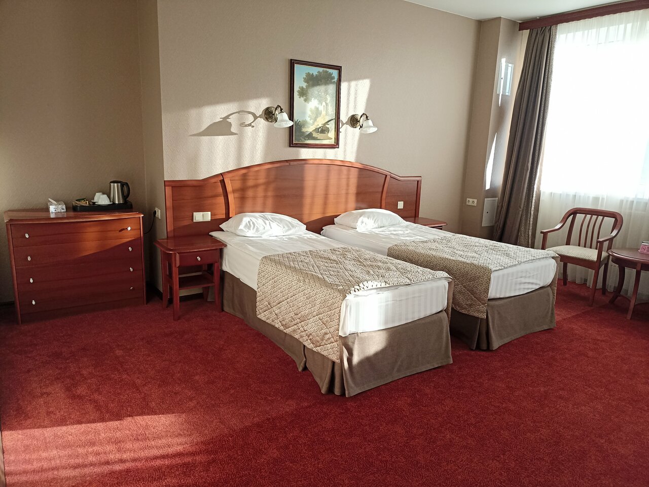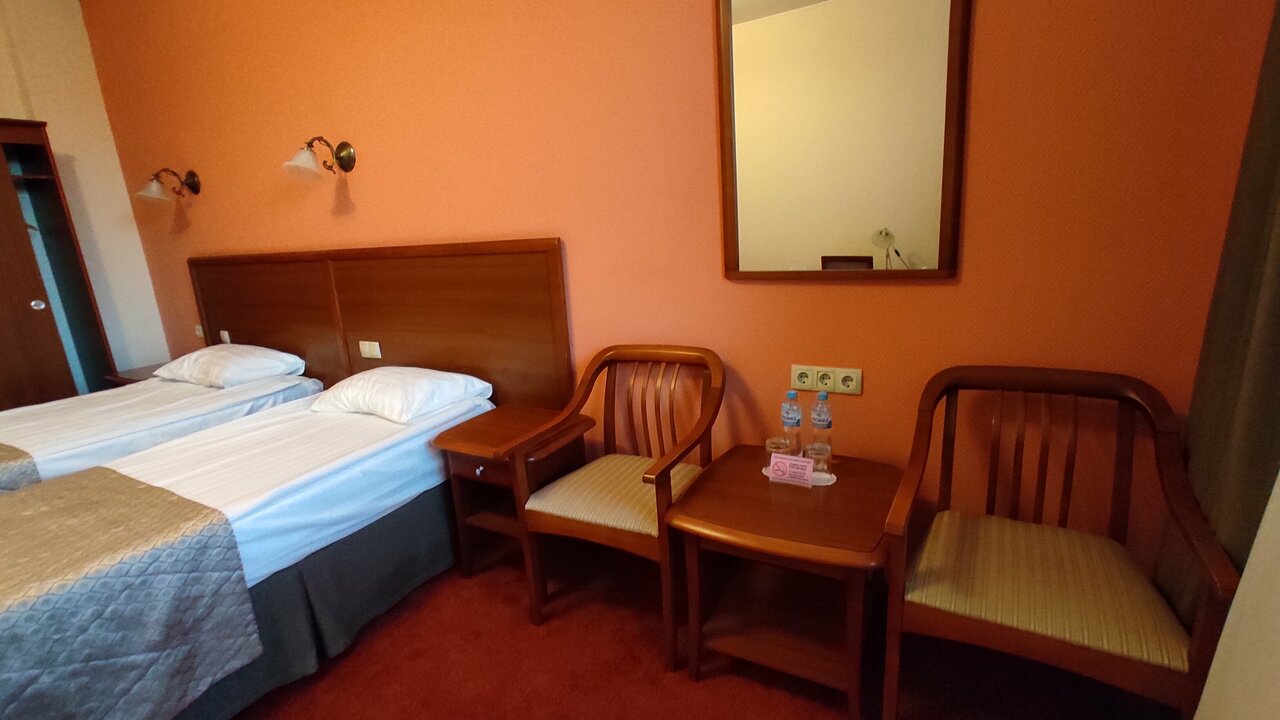 Стандартный двухместный номер — классический интерьер, мягкие тона, удобное рабочее место, двуспальная кровать или две односпальные кровати, достаточно места и для работы и для отдыха.