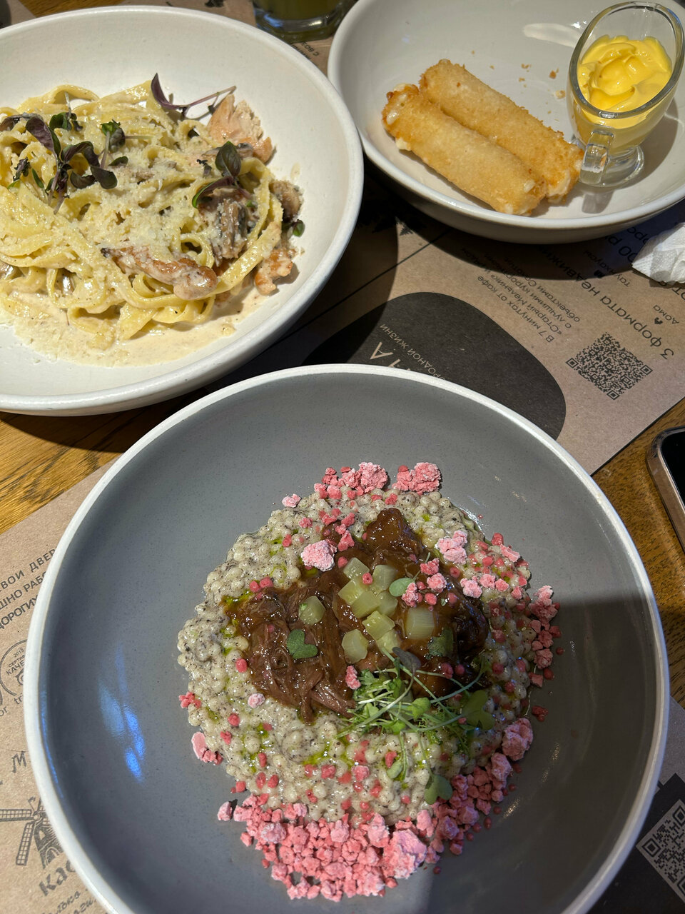 Очень уютно. Прекрасное обслуживание. Понравились салаты. Горячее на 4. Брали скоблянку и сома из печи. Рекомендую к посещению.