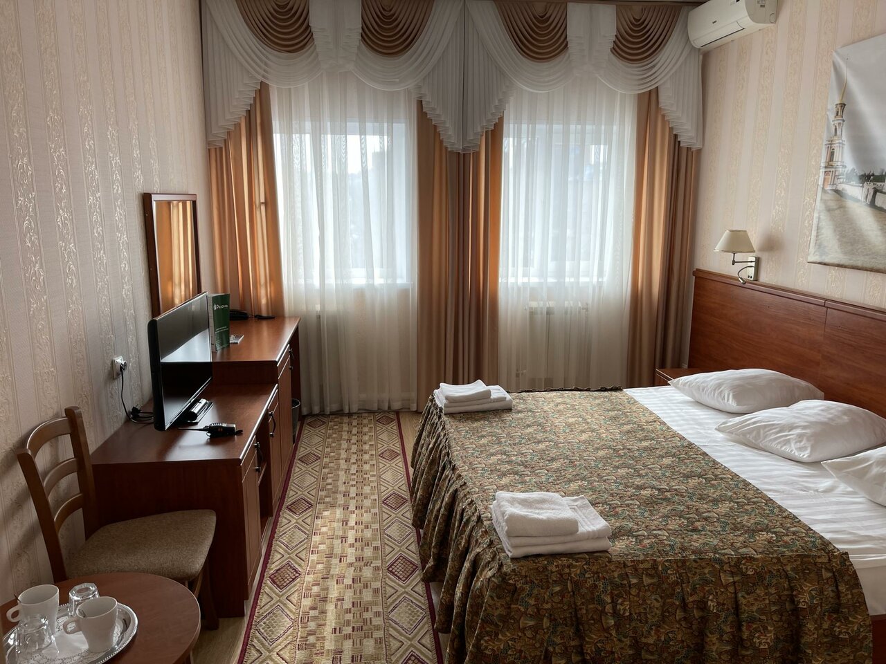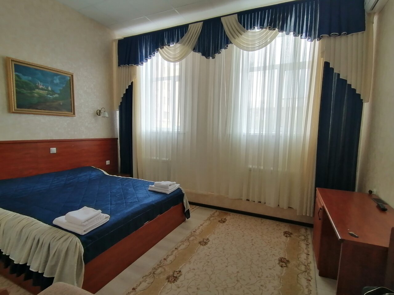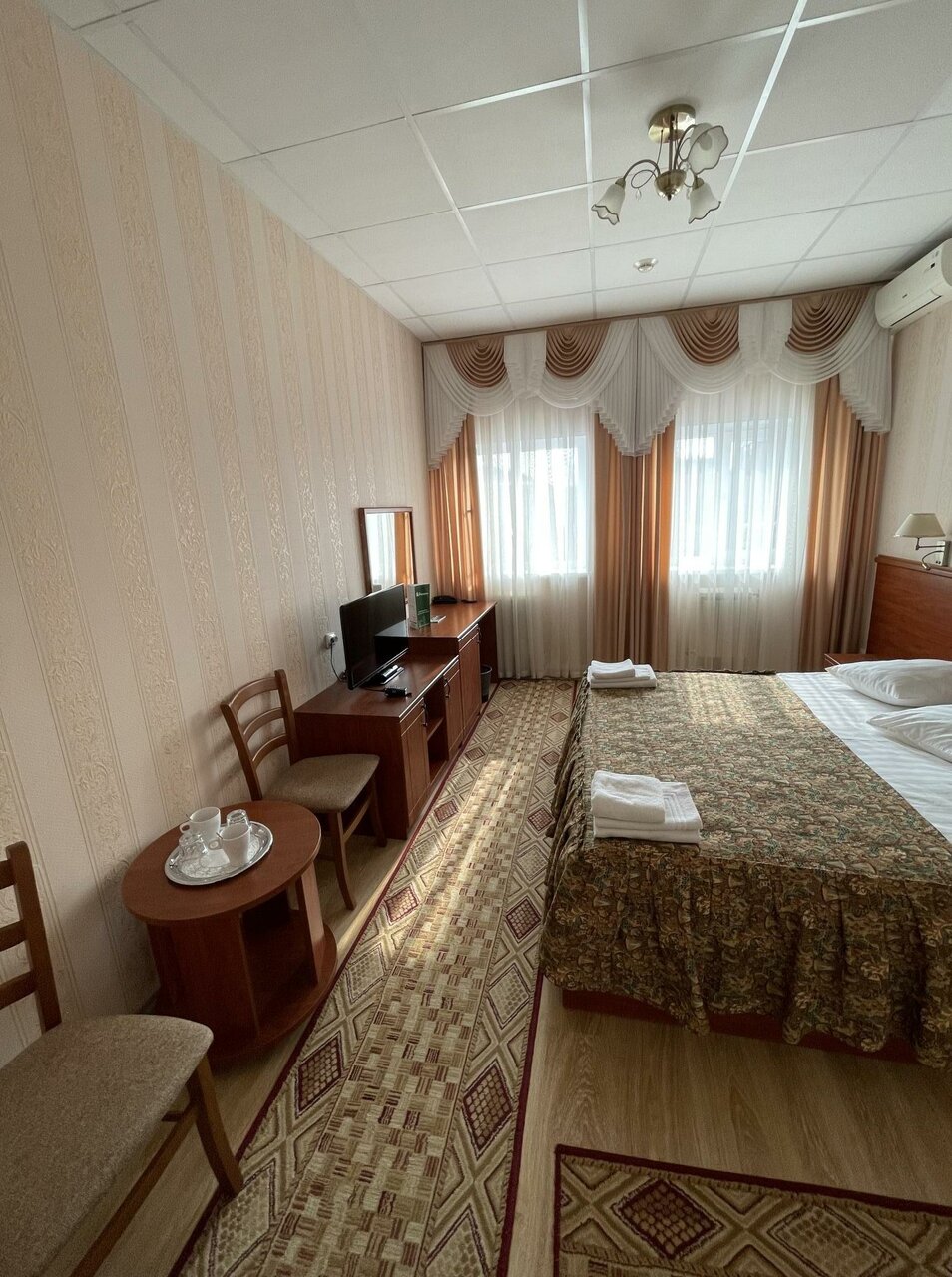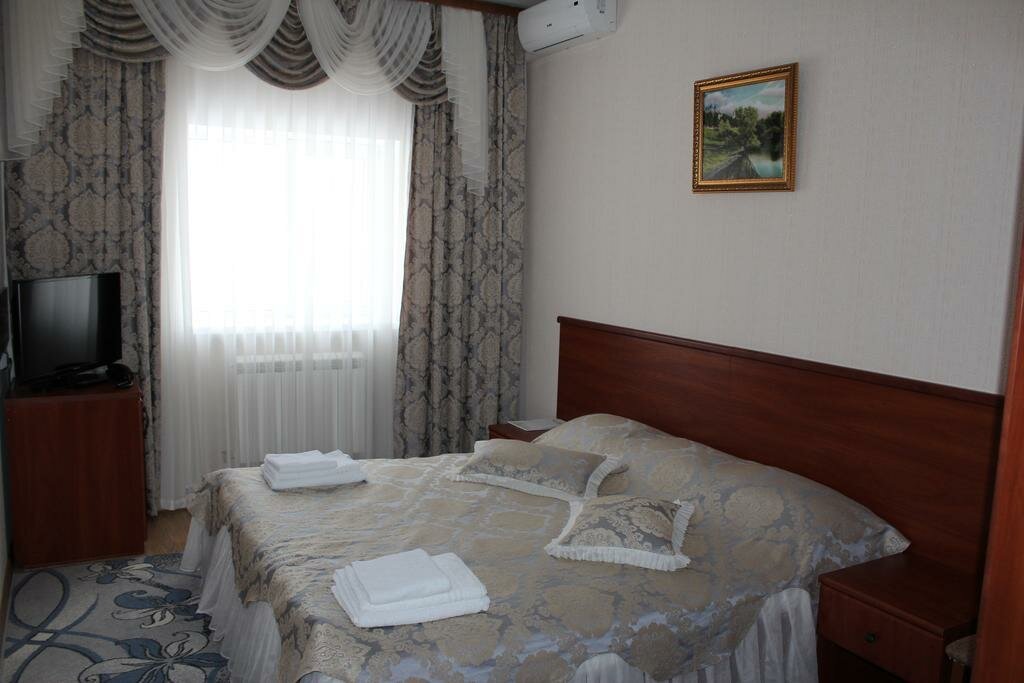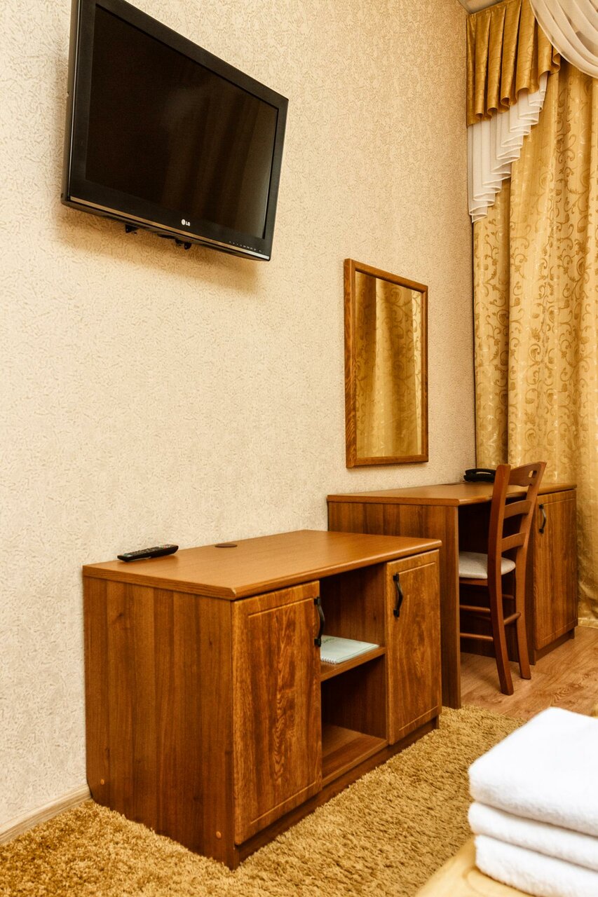 Просторный номер с высокими потолками, огромными подоконниками. Чисто, тепло. Отдельно отмечу очень чистые ковры, что мне как аллергику было важно. В ванной тоже чисто, каждый день кладут шампунь и гель для душа. В номере чашки, ложки, на этаже — кулер. Хорошие завтраки — каша, горячее, сосиски, омлет, салат, овощи, колбаса, сыр, блинчики/запеканка, свежие фрукты. Чай, кофе. Из минусов — невкусный кофе в столовой из автомата, никакущий вай-фай (слабый, даже картинки в ленте не прогружает) и маловато розеток (в ванной — ни одной, фен некуда воткнуть). В целом, хорошее сочетание цена/качество, близко до Кремля, недалеко остановка общественного транспорта, много автобусов и троллейбусов ходит.