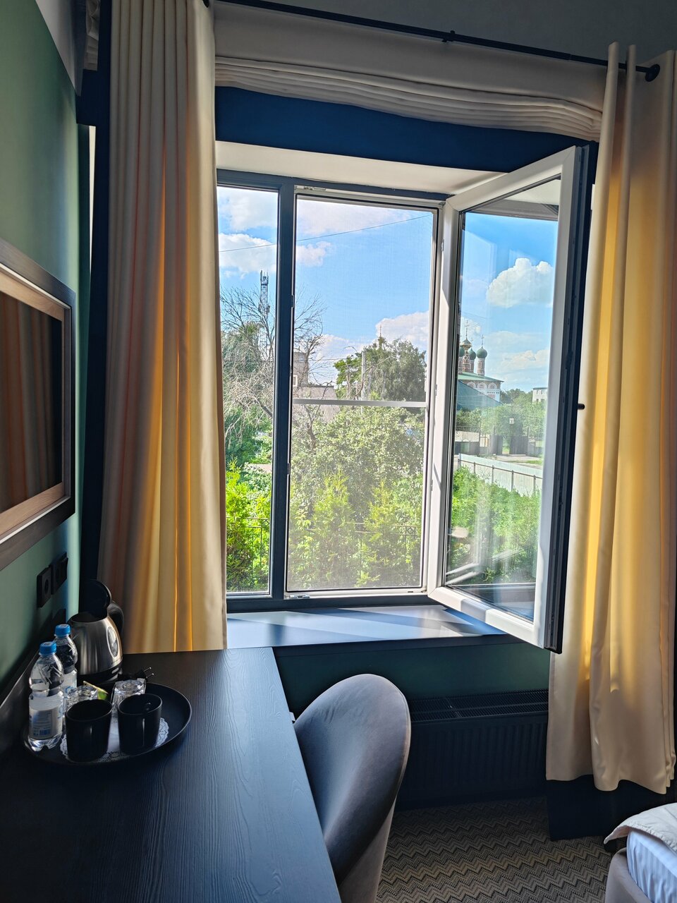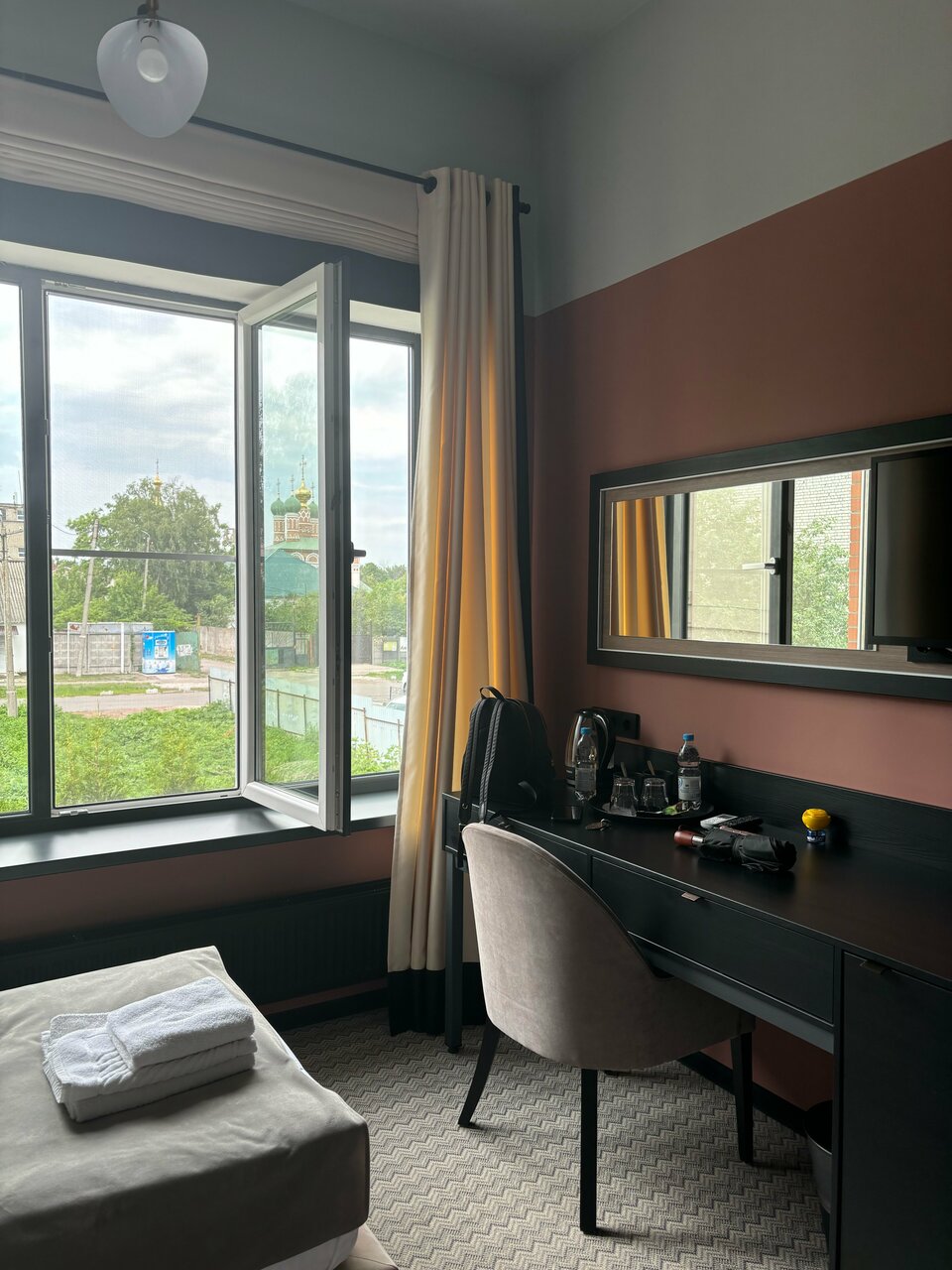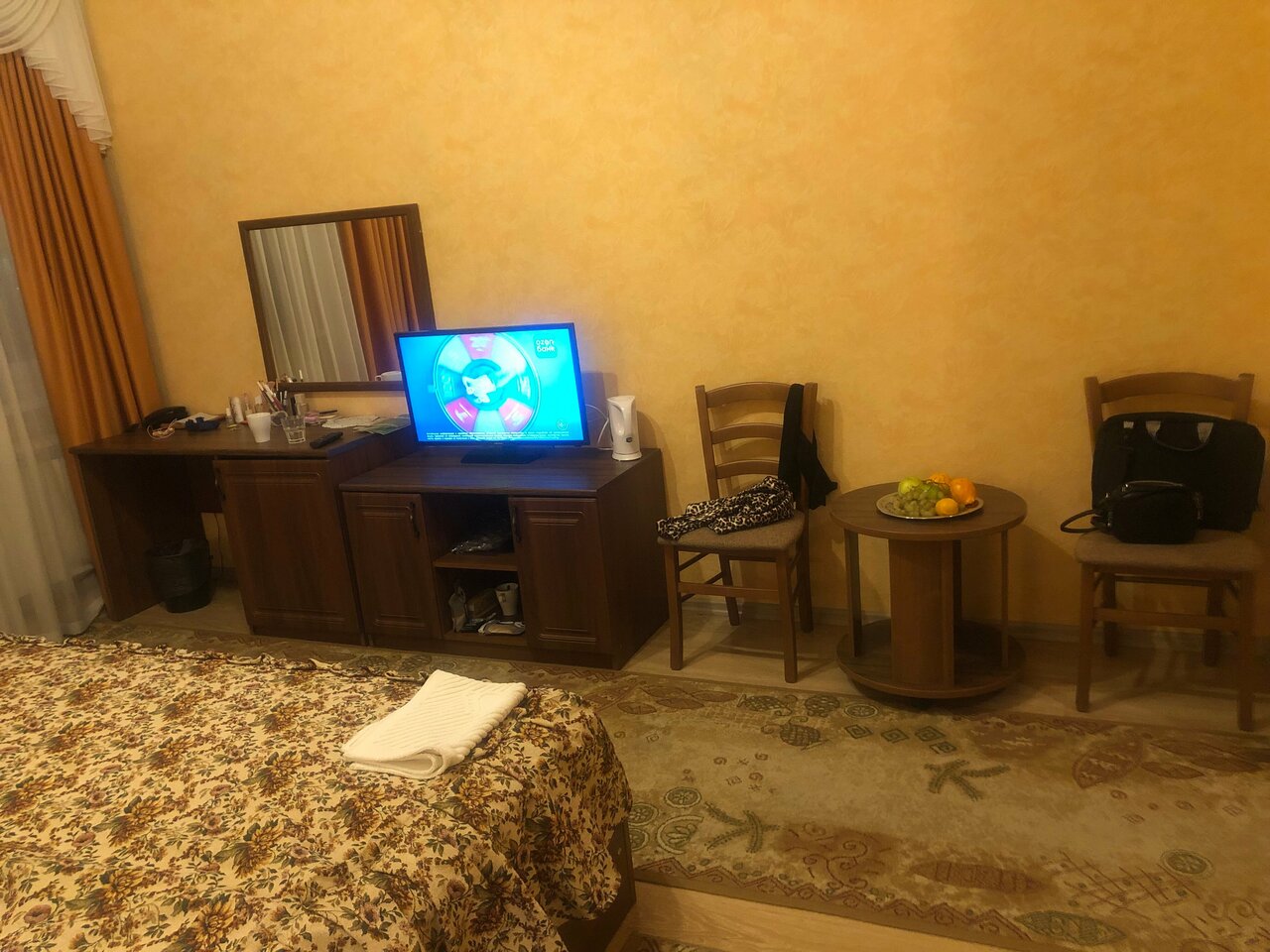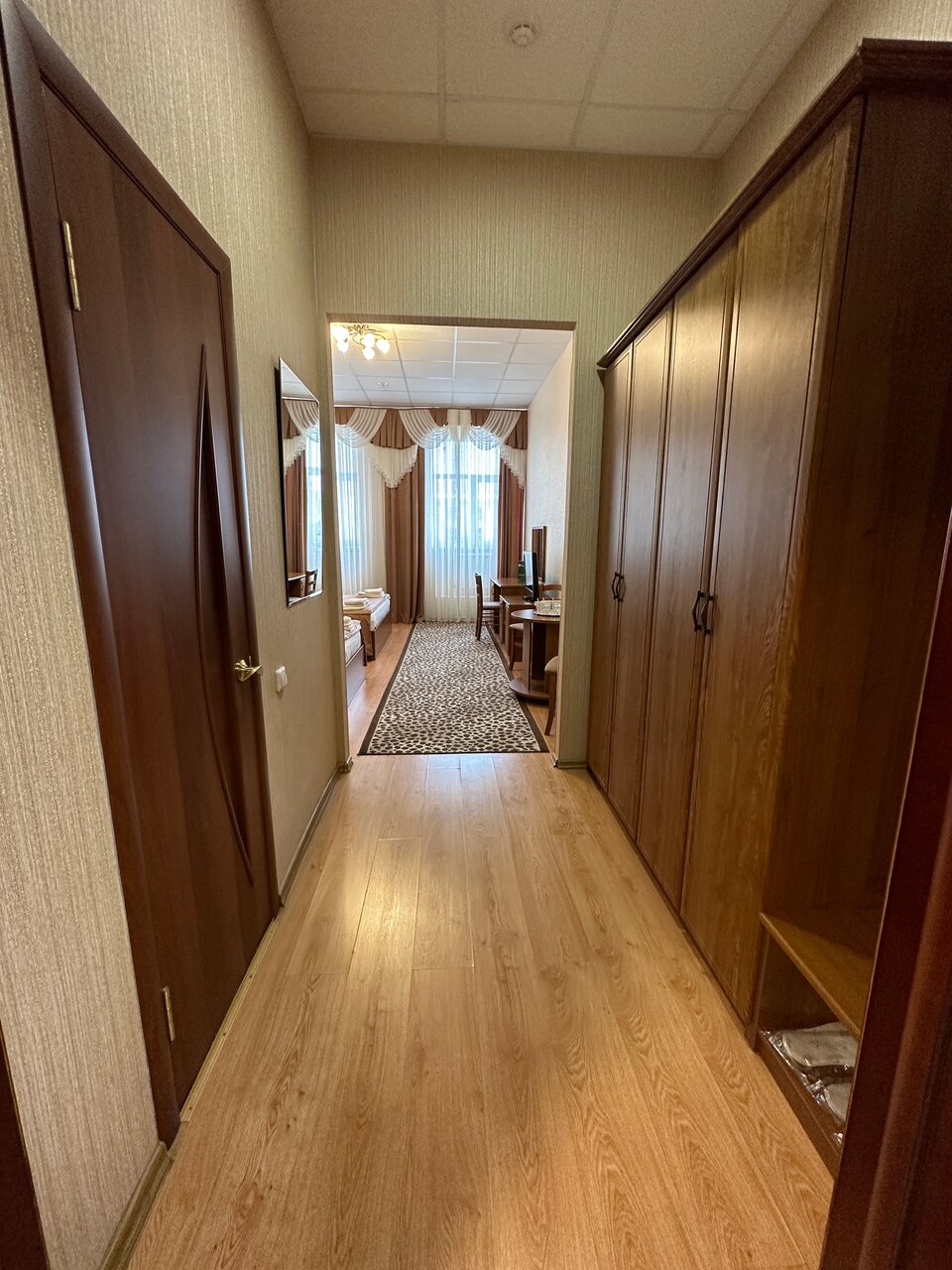 Просторный номер с высокими потолками, огромными подоконниками. Чисто, тепло. Отдельно отмечу очень чистые ковры, что мне как аллергику было важно. В ванной тоже чисто, каждый день кладут шампунь и гель для душа. В номере чашки, ложки, на этаже — кулер. Хорошие завтраки — каша, горячее, сосиски, омлет, салат, овощи, колбаса, сыр, блинчики/запеканка, свежие фрукты. Чай, кофе. Из минусов — невкусный кофе в столовой из автомата, никакущий вай-фай (слабый, даже картинки в ленте не прогружает) и маловато розеток (в ванной — ни одной, фен некуда воткнуть). В целом, хорошее сочетание цена/качество, близко до Кремля, недалеко остановка общественного транспорта, много автобусов и троллейбусов ходит.