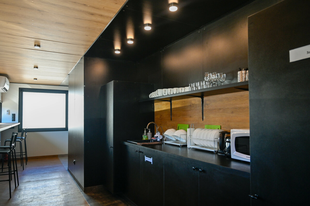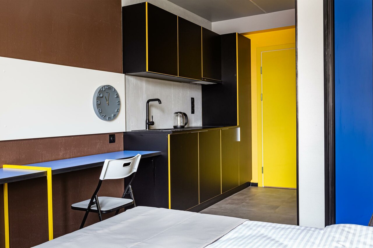 Двухместный номер с мини-кухней и кухонными принадлежностями.Площадь: 16 кв.м.Размер кровати: Двуспальная кровать 160*200 см.Услуги и удобства: мини-кухня, кухонные принадлежности, холодильник, душ и туалет в номере, телевизор, фен, туалетные прин