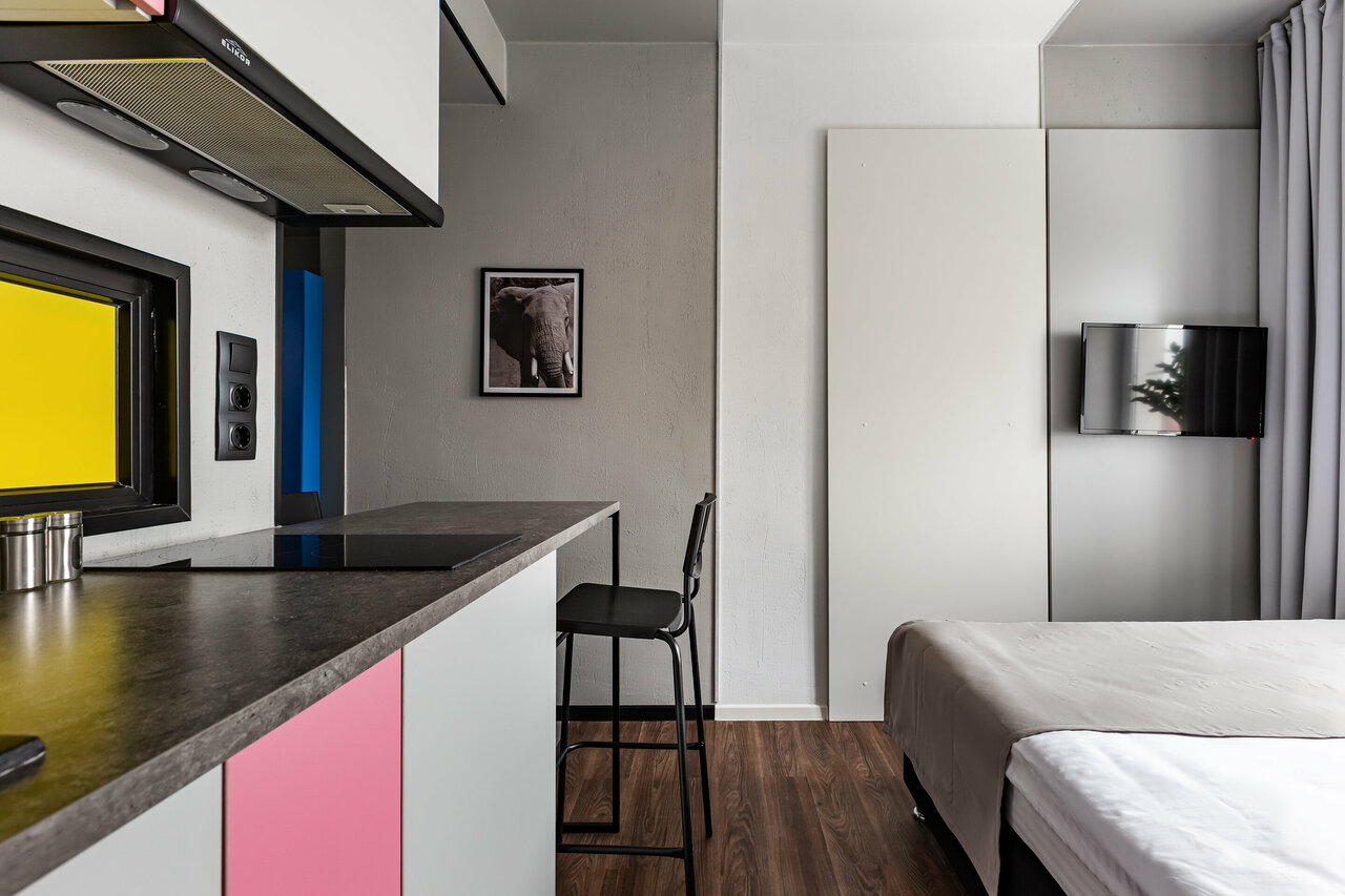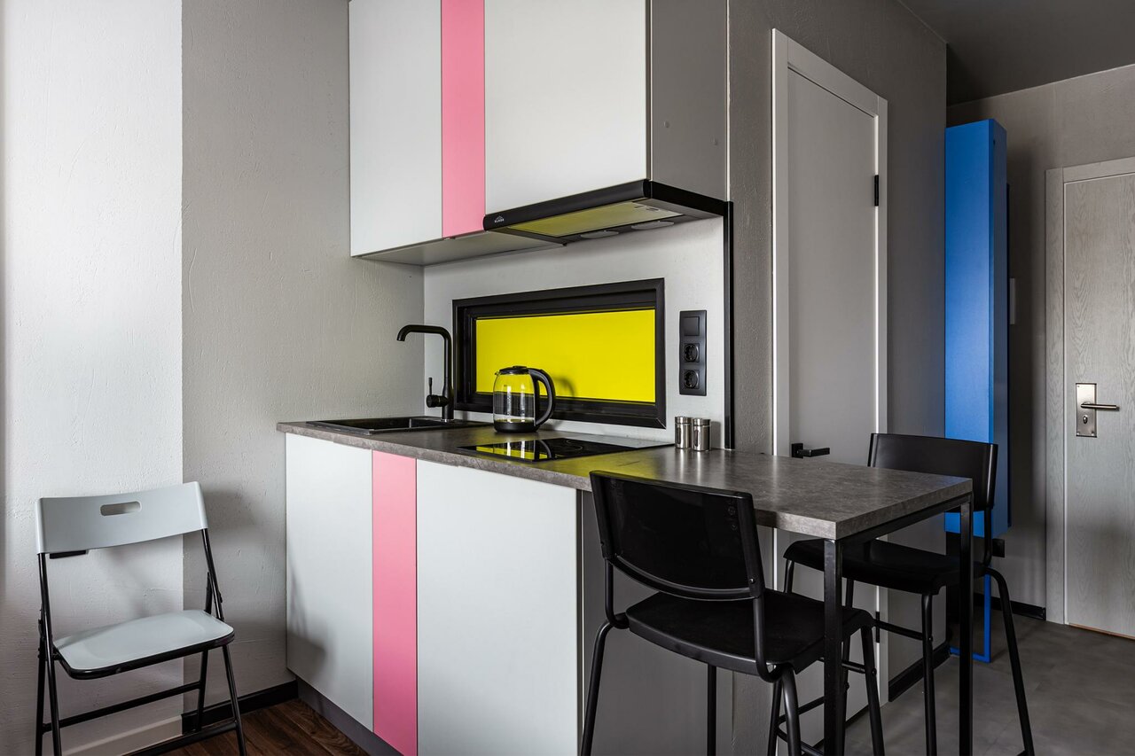 Отель понравился. У нас была двухуровневая студия с отдельным выходом и кухонькой. Пробыли две ночи. Чистота на уровне. Тесновато. Особенно когда разложили диван на первом уровне, между ним и столом почти не осталось пространства, чтобы пройти, например, в туалет. На втором уровне низкий потолок. Но это ладно, посредине проходит короб или балка. Вот об неё пару раз ударялись головой. Да и высокому человеку будет не развернуться. Понятно, что там только бросить кости, не более. Но и пройти к месту сброса тоже как-то надо. Зато очень симпатичная цена. И на кухне есть плита, достаточно посуды и приборов, чтобы приготовить ужин, например.