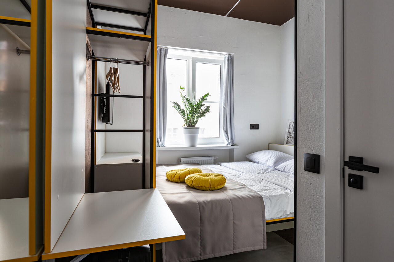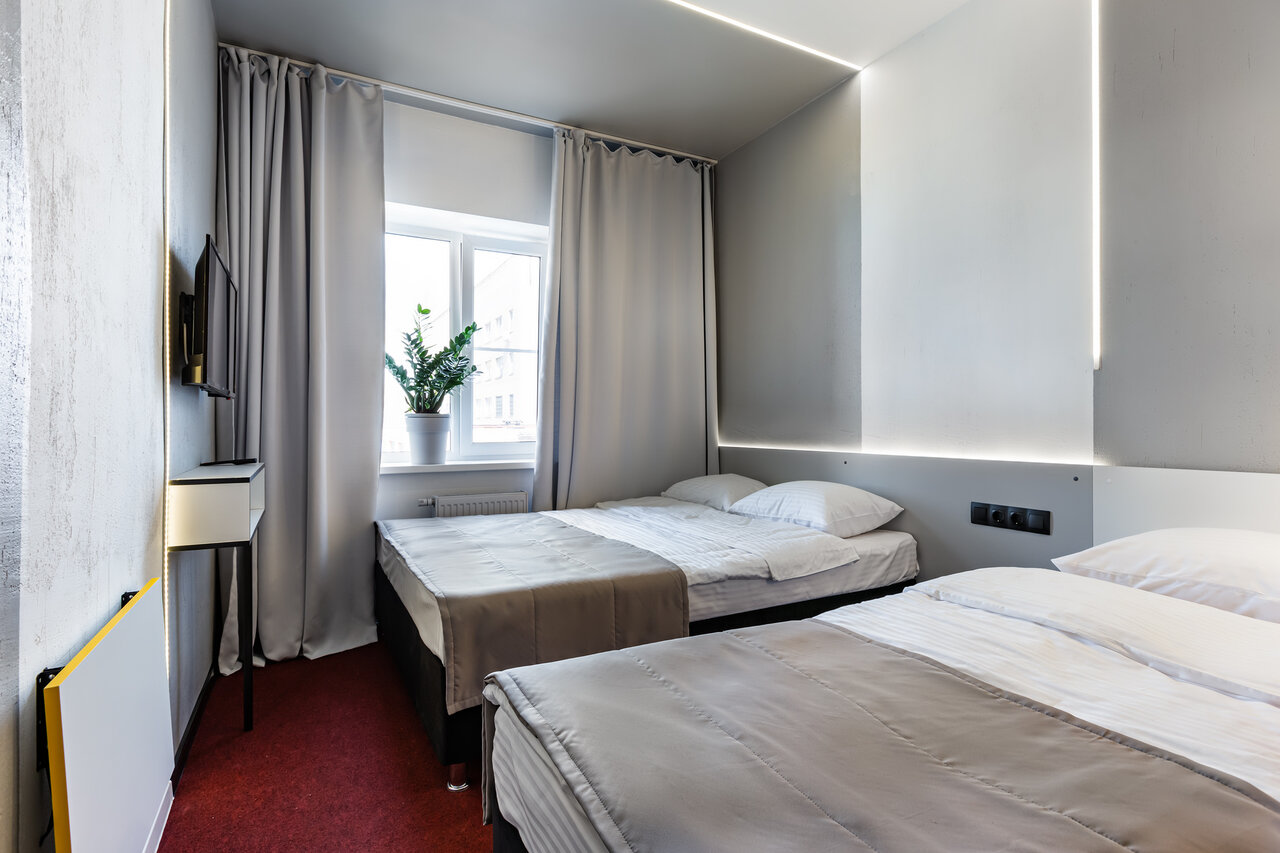 Уютный двухместный номер, с собственным душем и туалетом. Площадь номера: 12 кв.м.Размер кровати: двуспальная кровать 160*200 см.Телевизор, wi-fi, шкаф, белье, полотенца, туалетные принадлежности.