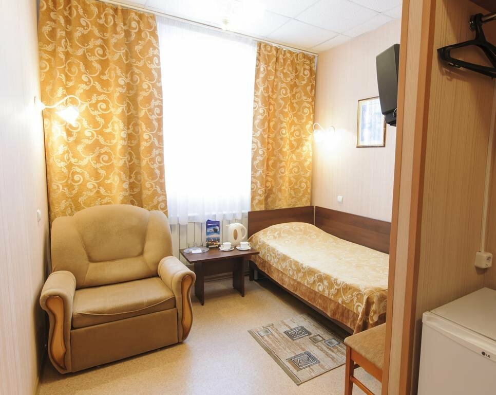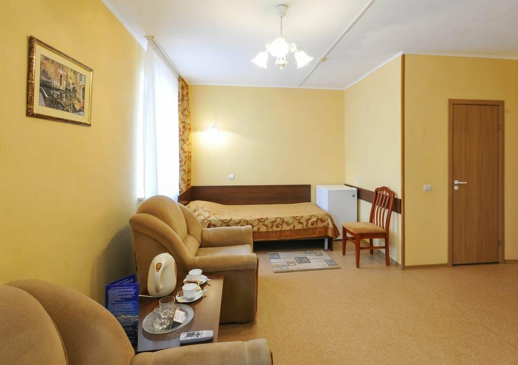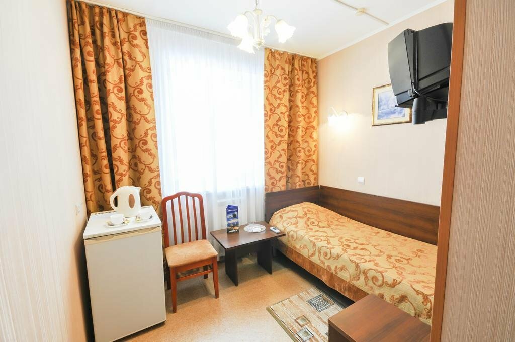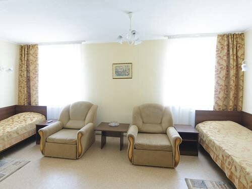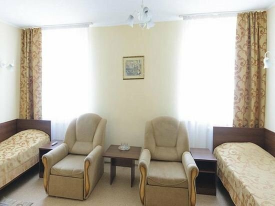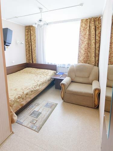 Из минусов: Номер очень тесный, мебель стоит впритык. Кресло старое, потртое. Одеяло колючее. В номере не убирались вообще всё три дня, что мы там находились с мужем. Мусорное ведро сами меняли, просили пакеты у них. Уходя на прогулки просили убраться в номере, бесполезно. Завтрак ужасный и отказаться от него почему то нельзя, хотя просили исключить завтрак из стоимости, мы ведь кушаем в кафе в городе, отказали. Душевая лейка неудобная, маленькая и напор воды кривой, сам душ вообще никак не фиксировался, приходилось его держать в руках, когда мылись. Раковина очень маленькая. Обои обшарпанные и отклеиваются. Из плюсов: В номере очень тепло.