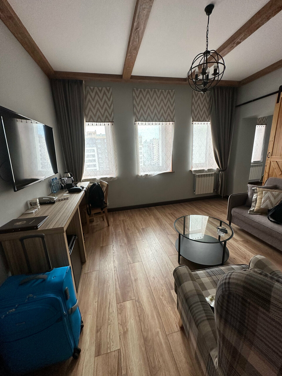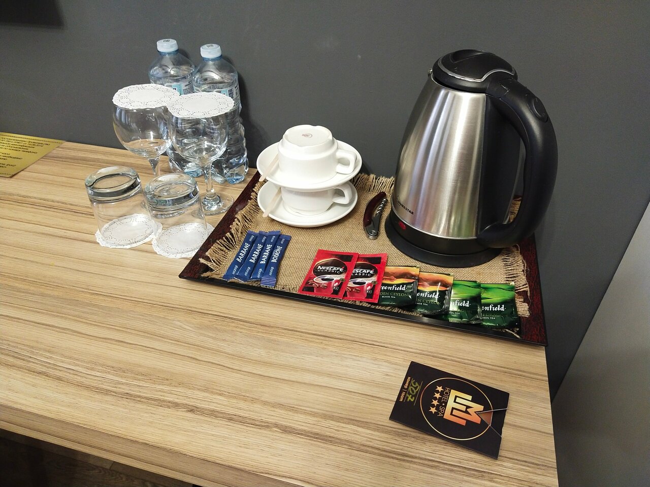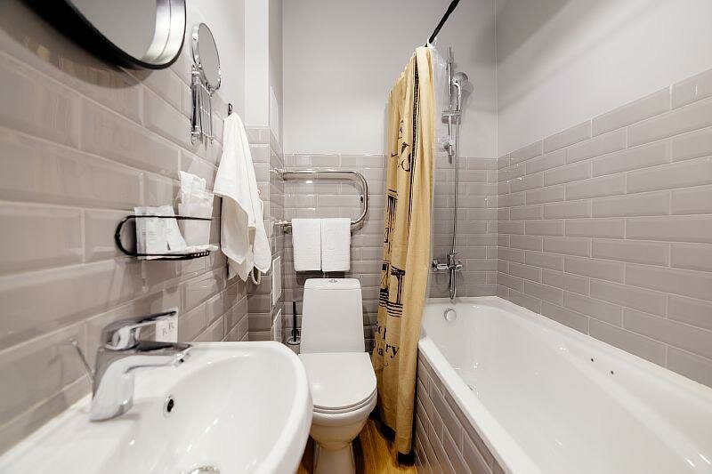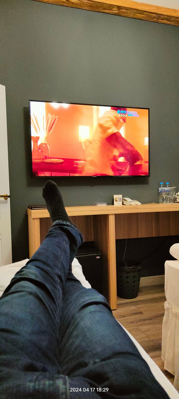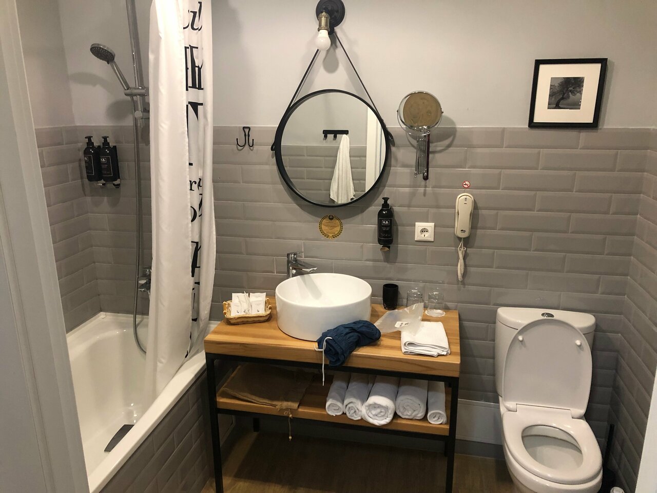 Отличный комфортный просторный номер, всё в наличии: чайник, посуда, чай, кофе, гигиенические наборы, халаты. В гостинице есть лифт, тренажерный зал (с групповыми занятиями!), прекрасны бассейн, курительные комнаты, ресторан. Красивы дизайн. Вежливый персонал: провели по отелю, все показали-рассказали. Порадовало, что позволили оставить вещи на время после выселения. Рядом ТЦ, кинотеатр, парковка. По расположению не особо центр, но это, пожалуй, единственный минус.