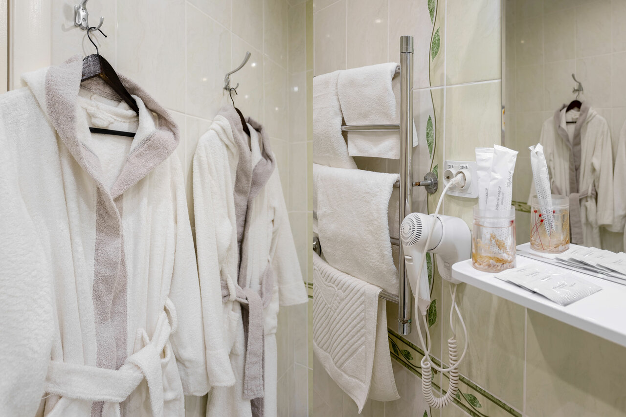 - Полный набор удобств (халаты, тапочки, средства гигиены, холодильник, кондиционер).