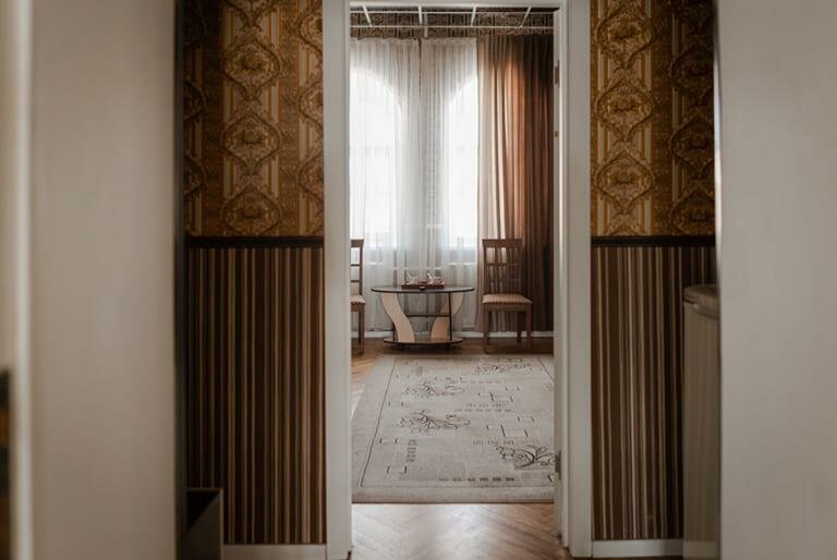 - Высокие потолки, просторные номера.