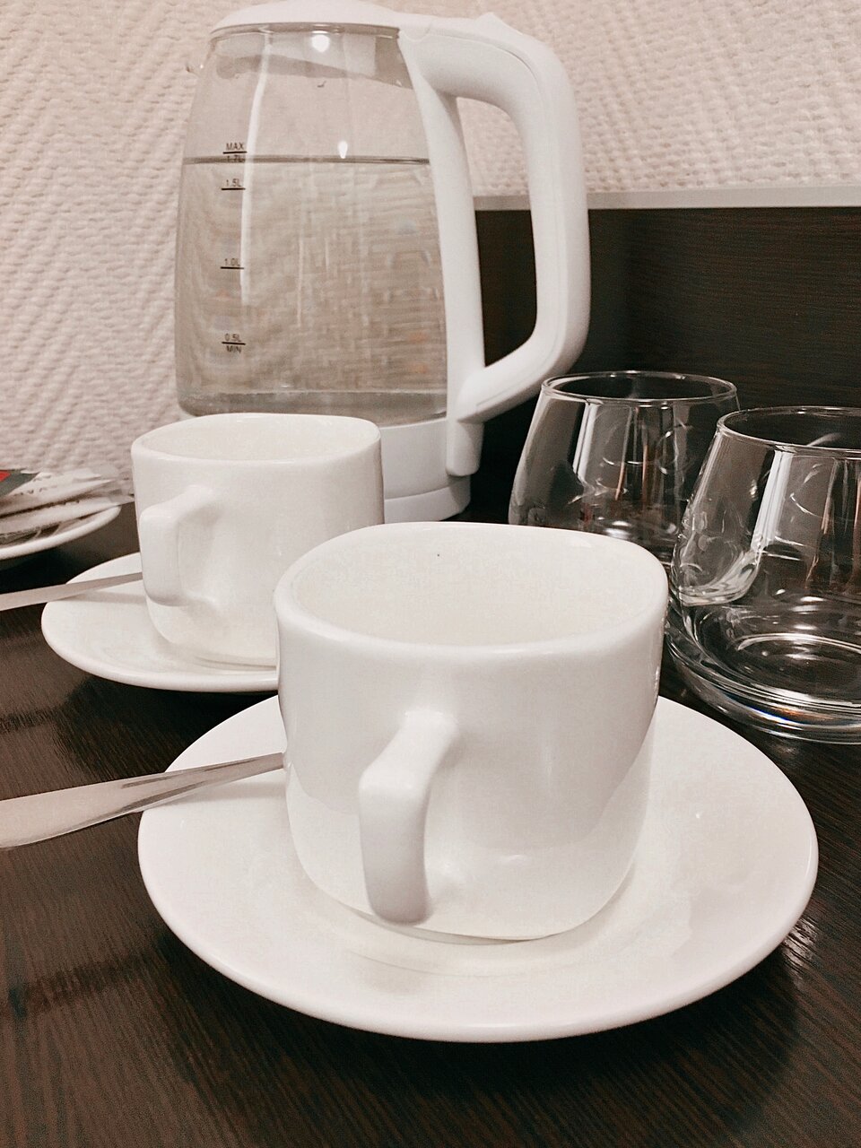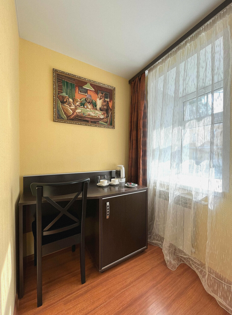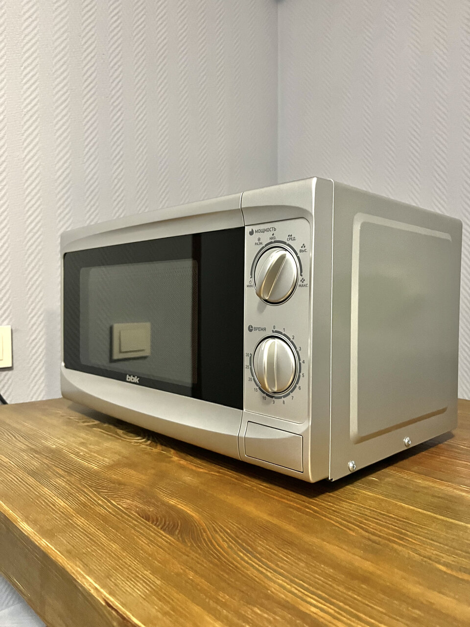 - В номерах есть всё необходимое (чайник, микроволновка, холодильник и т. д.).