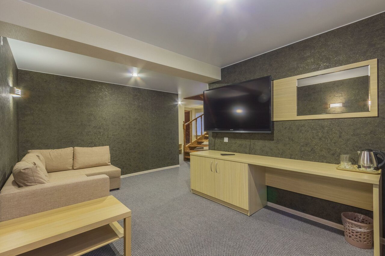 Большой двухэтажный номер 32 кв.м. с одной двухспальной кроватью и двумя раскладными диванами.