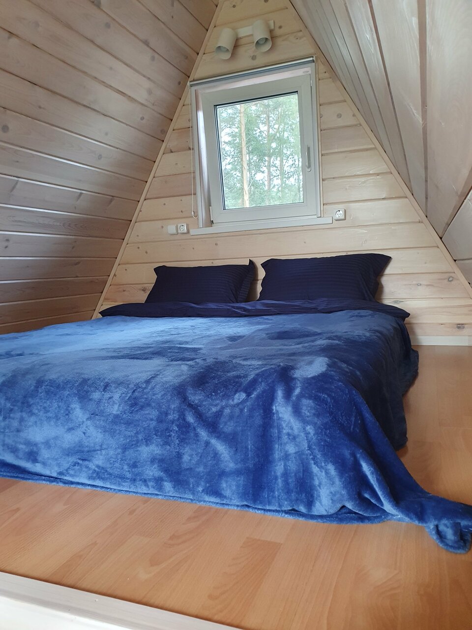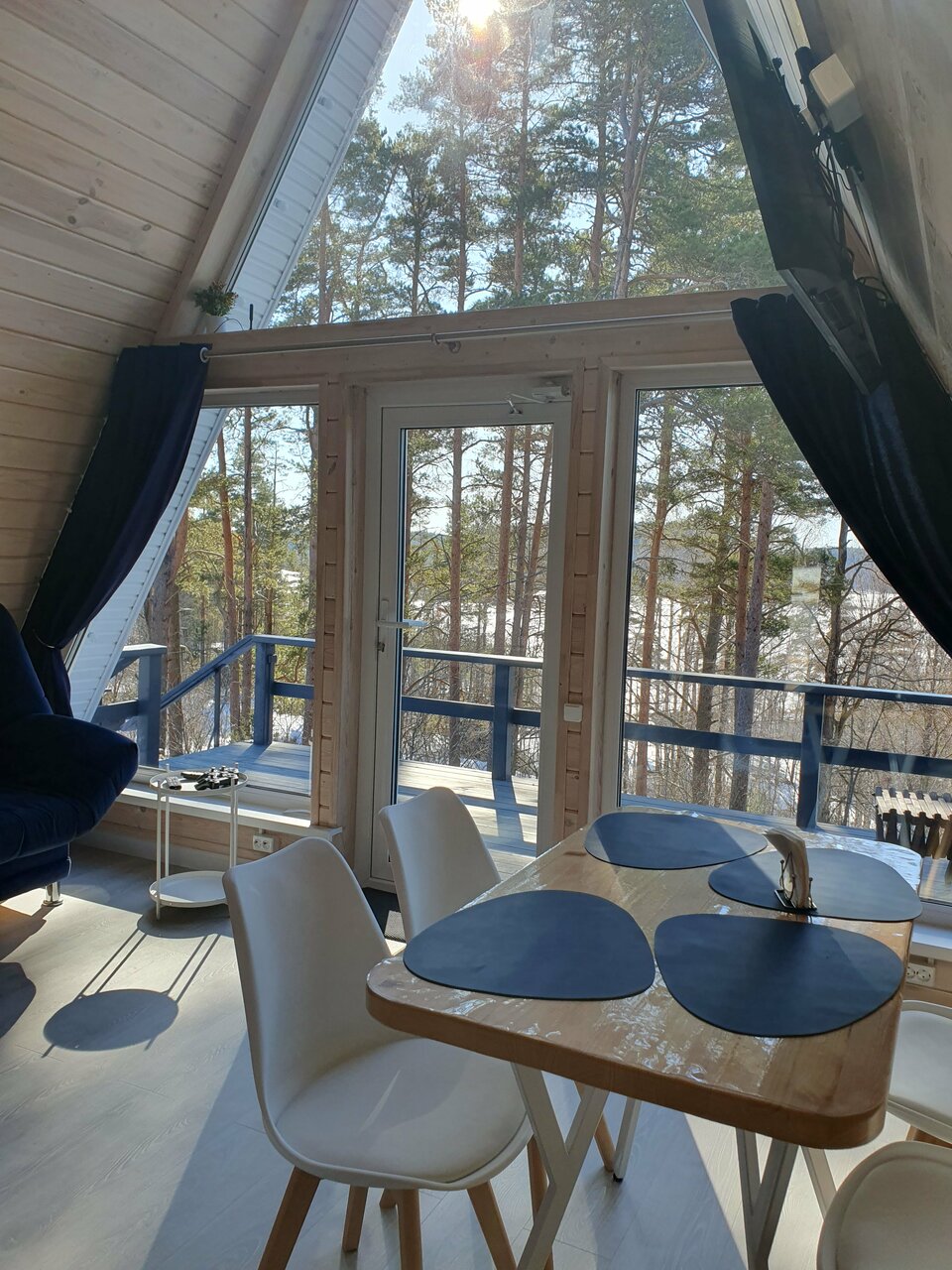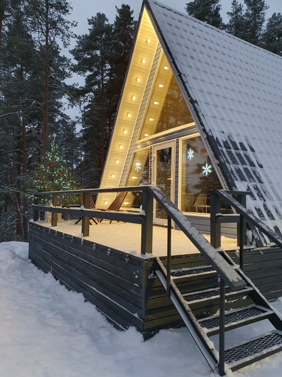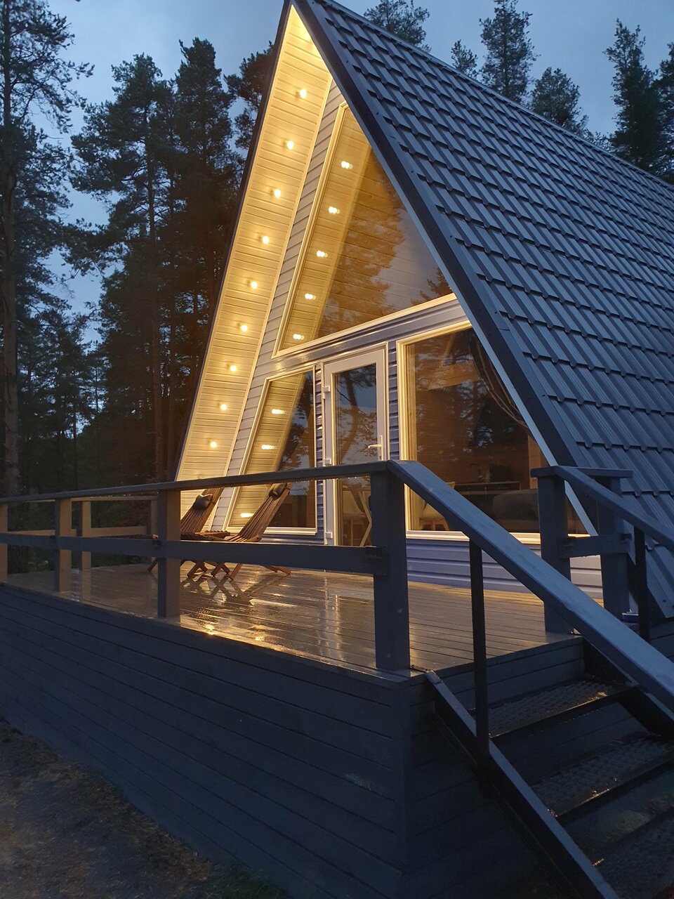 Уютный A-frame на скале для 4 гостей с: — Лофт-спальней и раскладным диваном — Кухней (плита, холодильник, кофемашина, посуда) — Террасой с видом на озеро — Камином, Wi-Fi, телевизором, настольными играми