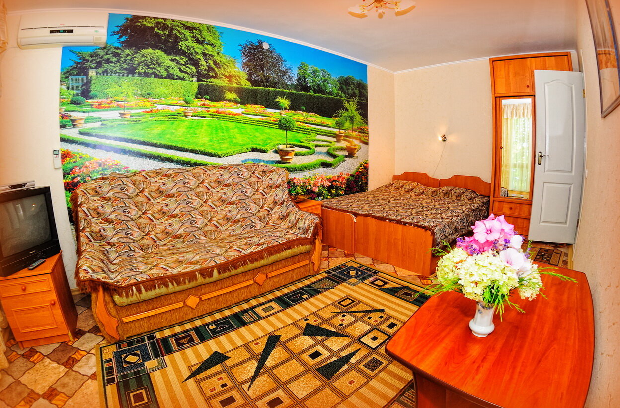 Всем привет, были первый раз. Сразу впечатляет на всей территории японский сад, все в зелени, тенек.. Номер уютный, всё классно… Еда-3-х разовое питание на оч хорошем уровне… Из минусов, холодильник один на всех я так понял и нет ТV. До моря 5 мин.очень чистое и тёплое.рекомендую!!!!
