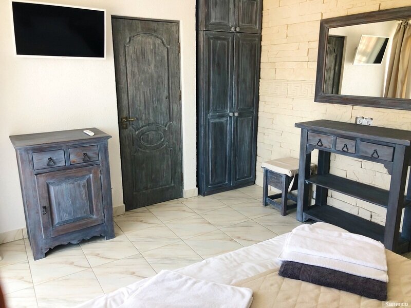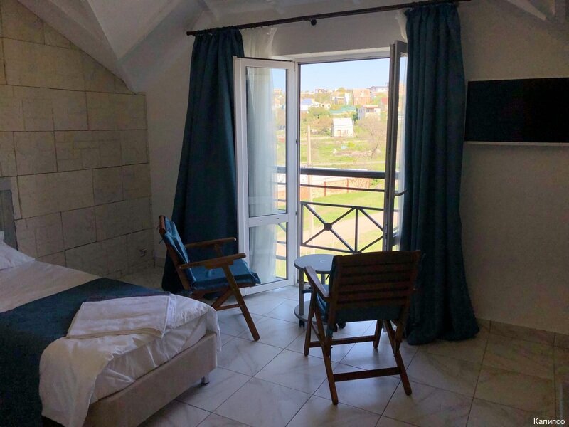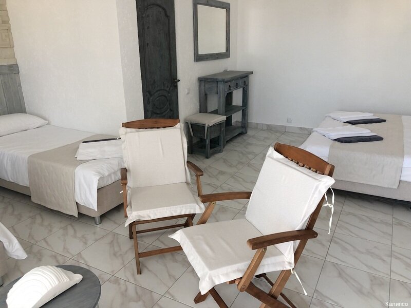 ‘Калипсо’ совершенно новый, очень уютный отель. Нас порадовал продуманный интерьер, цветовой дизайн, очень красивая обстановка. Видно, что строили и оформляли с профессионализмом и любовью. Следует сказать, что сам отель построен в греческом стиле, это отвечает идеи его названия. Номер очень уютный, все чистое, убираются по первому требованию. В номере очень удобная кровать, есть кондиционер, холодильник, большая душевая. Все номера имеют вид на море, которое находится в минуте ходьбы. Очень было приятно вечерами сидеть на веранде и слушать шум прибоя. Можно присвоить полноценных 4-ре европейских звезды. Хозяева отеля прекрасная семейная пара, очень внимательная и приветливая. Итак, главные плюсы отеля: расположение близко к морю, чистота, уют, хорошая кухня (разнообразная, вкусная, можно выбрать); есть бассейн, барбекю, внимательное обслуживание. Ольга (июль, 2019)
