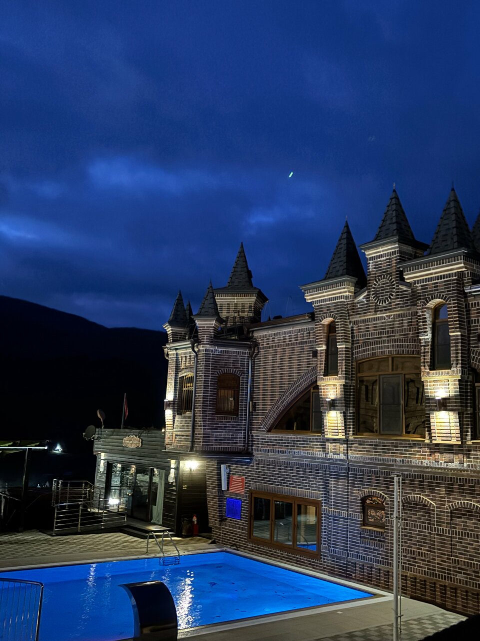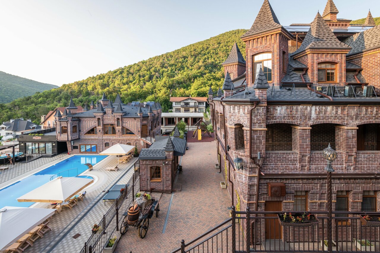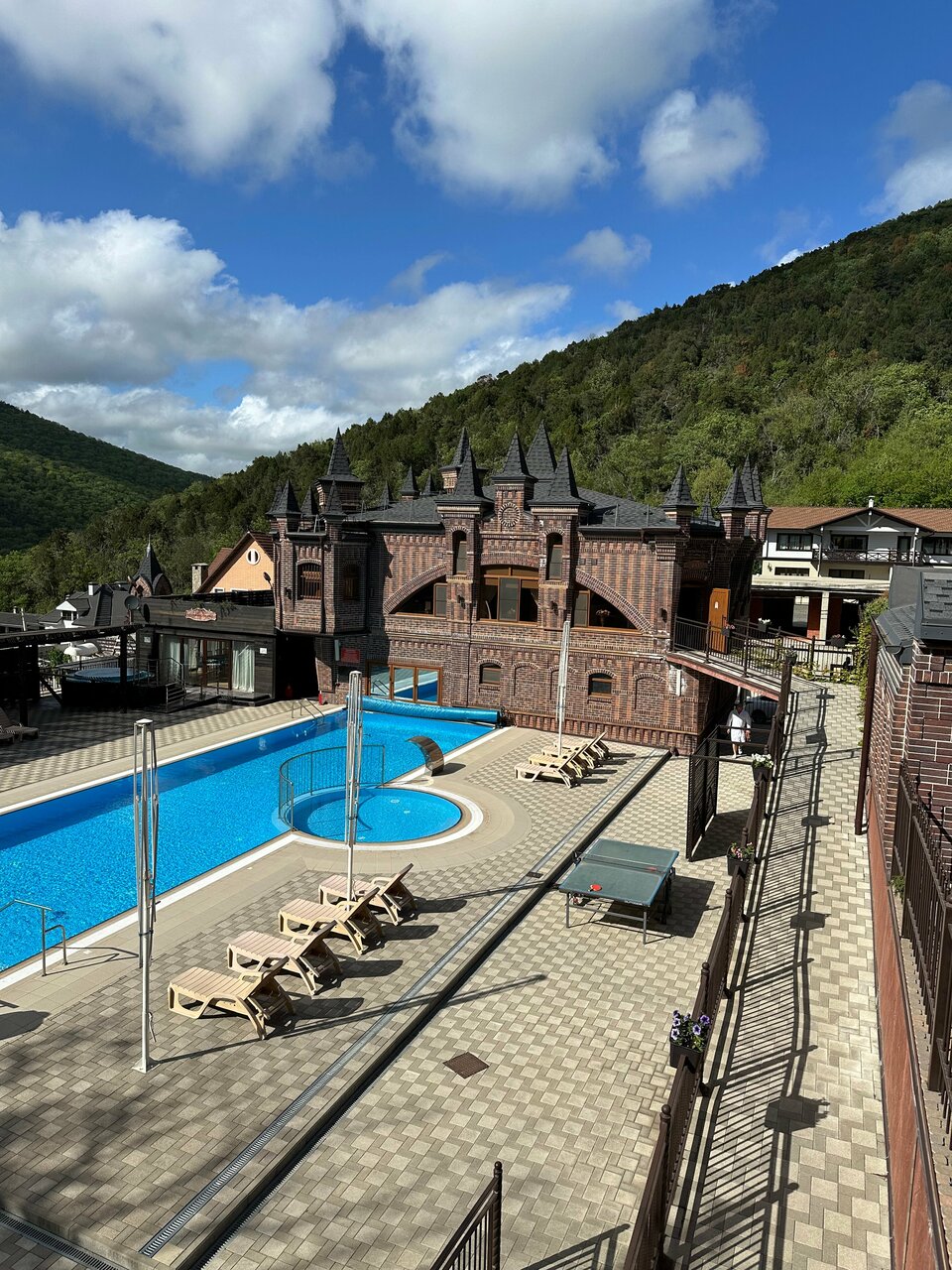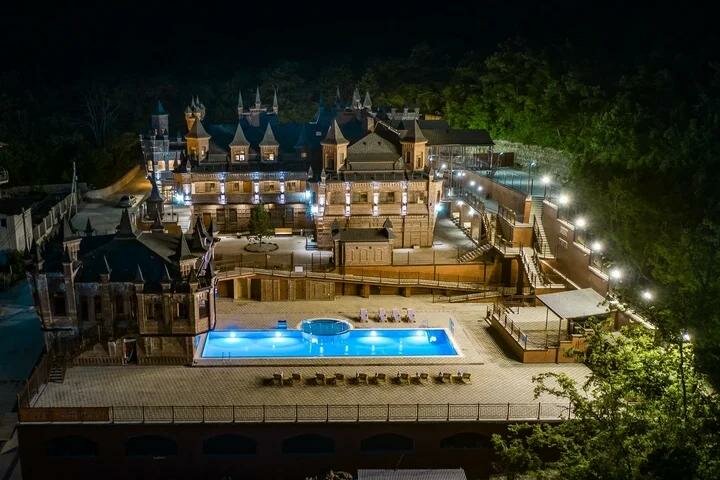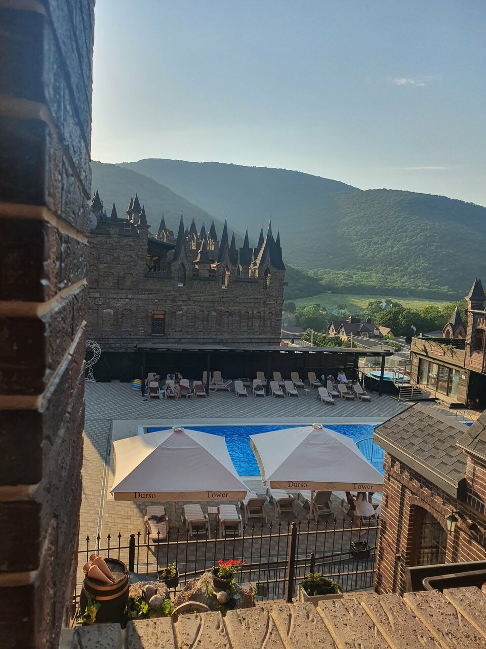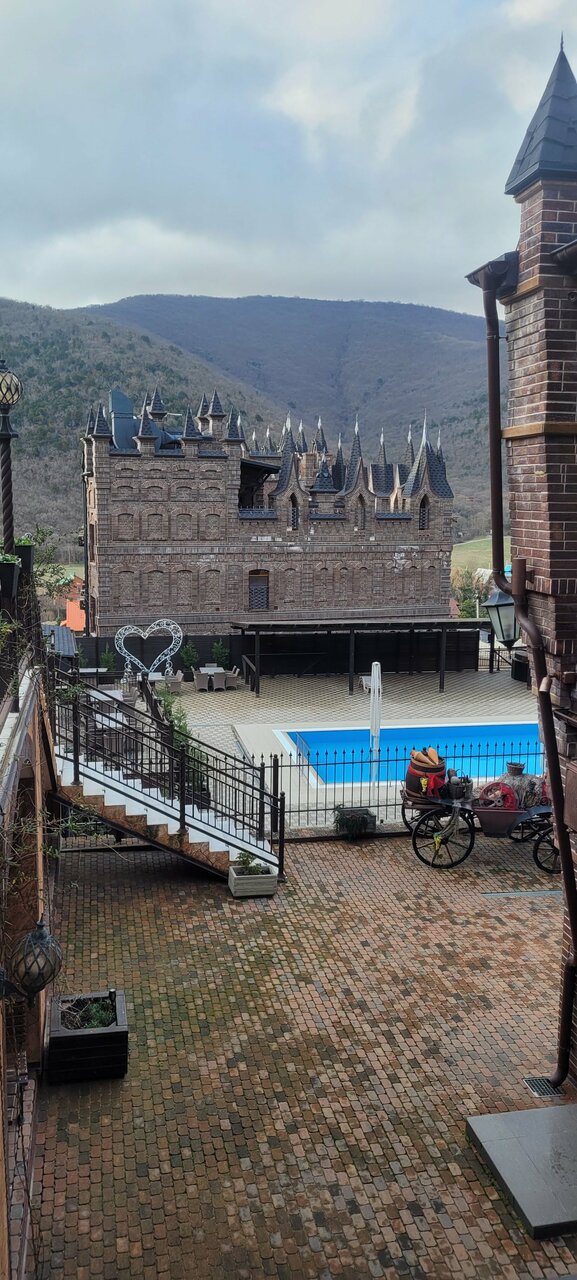 - Красивая территория и архитектура (отель-замок под старину).; Развлечения (бильярд, теннис, мангальная зона).; Живописные виды и ухоженная территория.; Чистые, уютные и полностью оснащённые номера (полотенца, халаты, принадлежности).; Отличный банный комплекс (хамам, бассейн, джакузи).