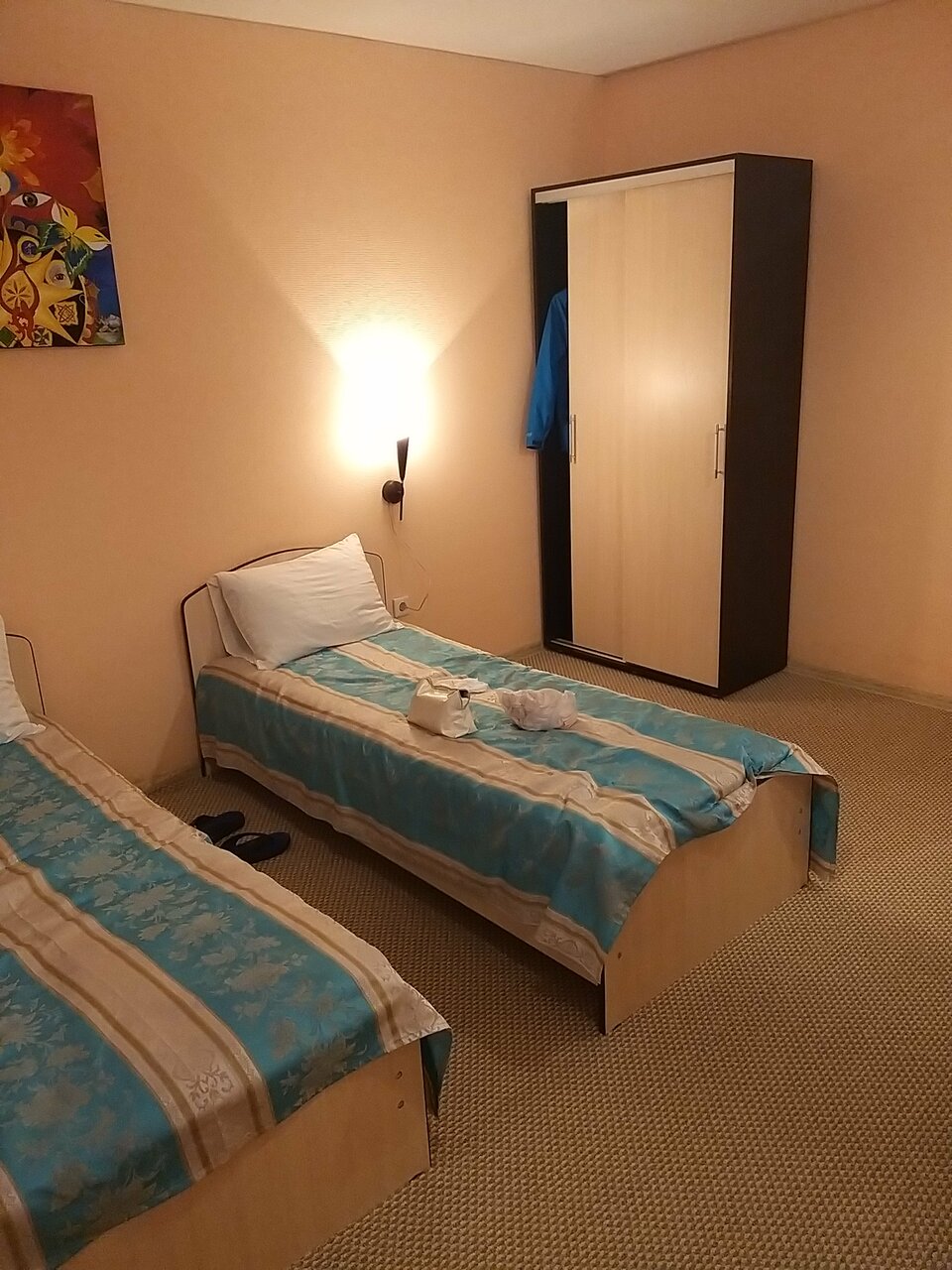 Двухместный номер с двумя раздельными односпальными кроватями. В номере расположен санузел с душевой, а также рабочий стол, кондиционер, ТВ и мини-холодильник.Стоимость за 1 человека - 2400 рублейСтоимость за 2 людей - 2600 рублей
