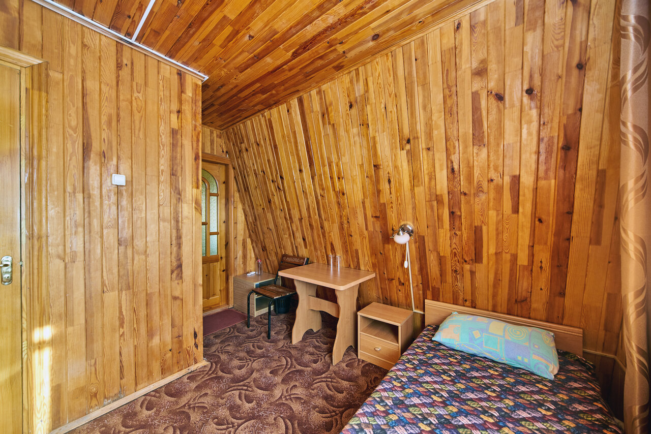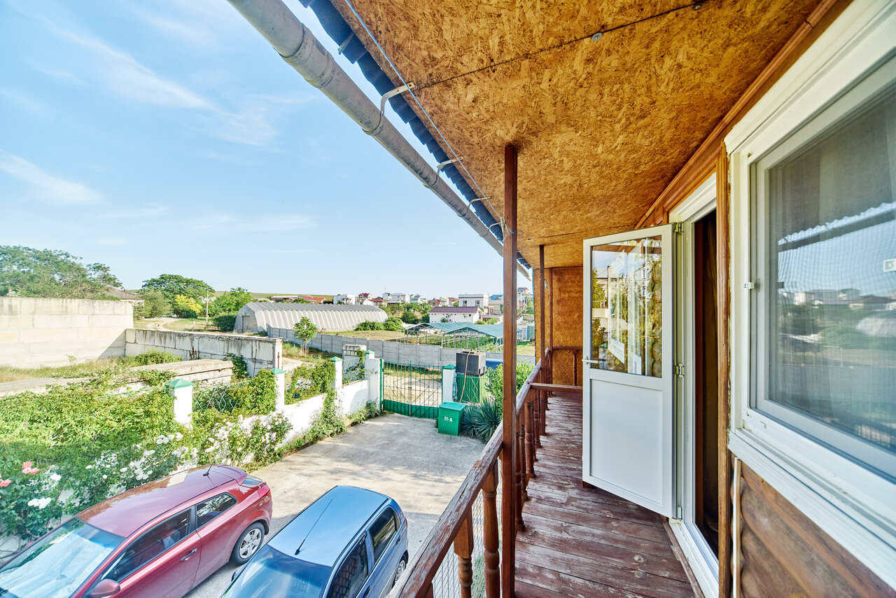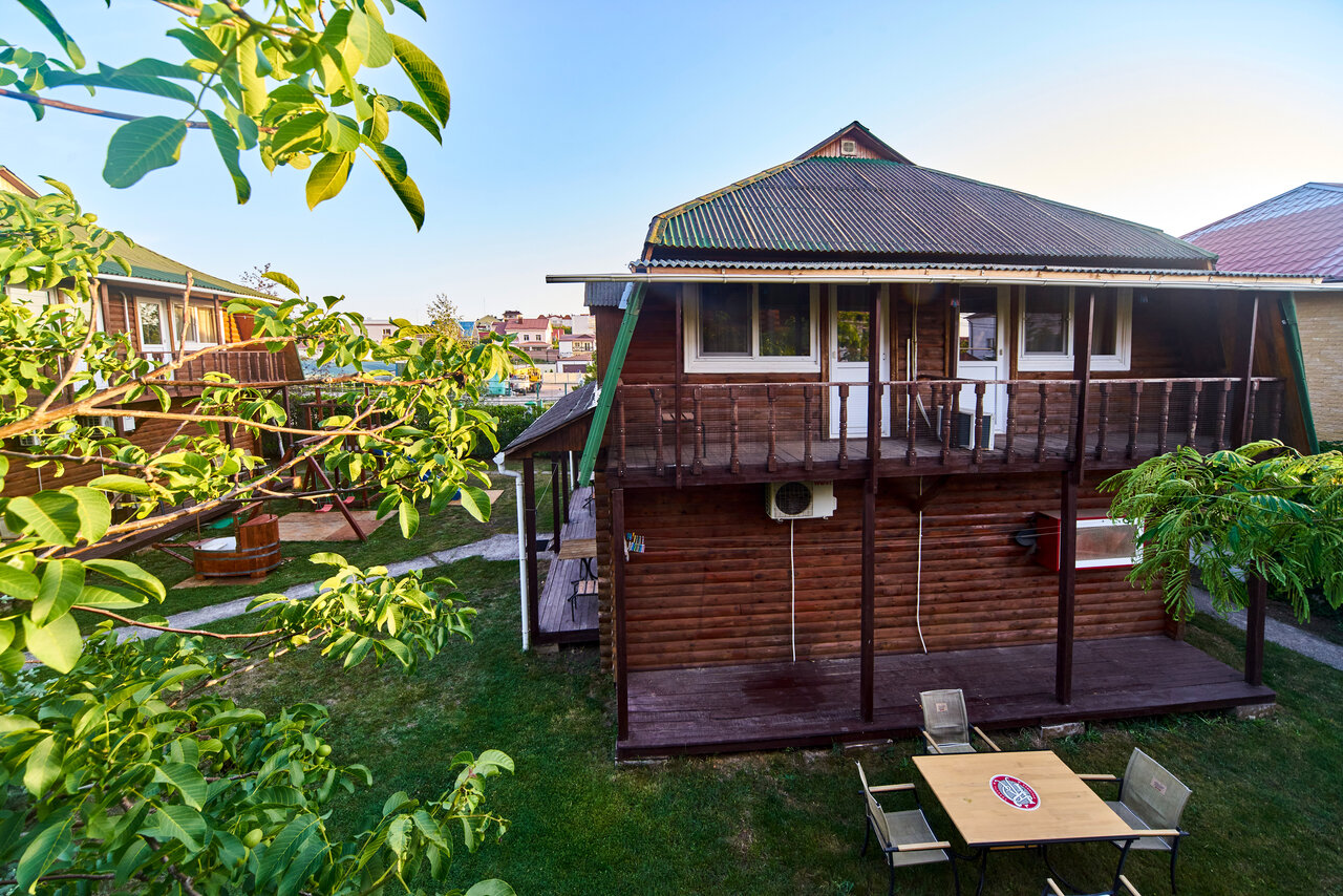 Деревянный дом, с террасой, есть где сушить вещи, во дворе столовая с детской площадкой. Wi-FI есть. Тихо и уютный снт, ощущение, что на даче. Огромное преимущество чистый галичный пляж, красивое море, туда приезжают отдыхать Симферопольцы. Очень понравилось, рекомендую.