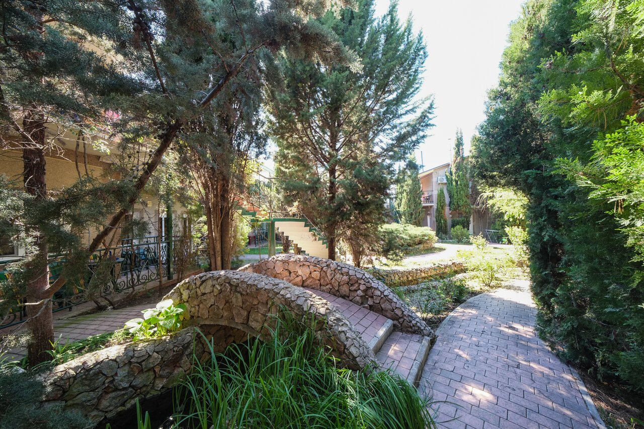 Одна из лучших бюджетных гостиниц на юбк. Номера уютные и чистые,на територии создан отличный микроклимат. Все утопает в зелени,тень и прохлада постоянно. По всей прилегающей площади протекает искуственная речка,лягушки и кувшинки,золотые карпики радуют глаз. После 20го августа сезонная скидка. Уже несколько лет привожу к ним родителей на бархотный сезон,очень довольны до моря 50 метров.