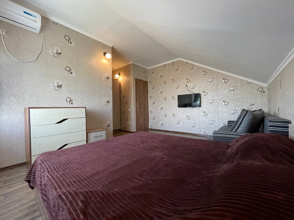 Люкс 5 местный с кухней и балконом на 2 этаже Большая 2х спальная кровать, раскладной диван, шкаф, комод, столик журнальный, телевизор, кондиционер, Санузел с душевой, стиральная машинаНа кухне холодильник, плита, чайник и посуда20000- Месяц