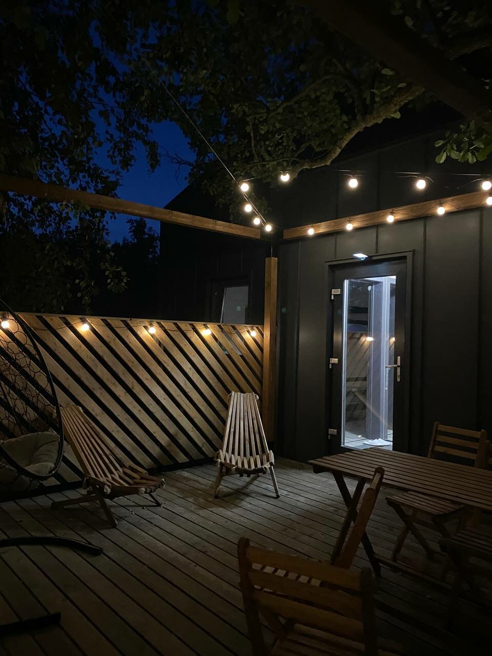 - Терраса с качелями и видом на лес.