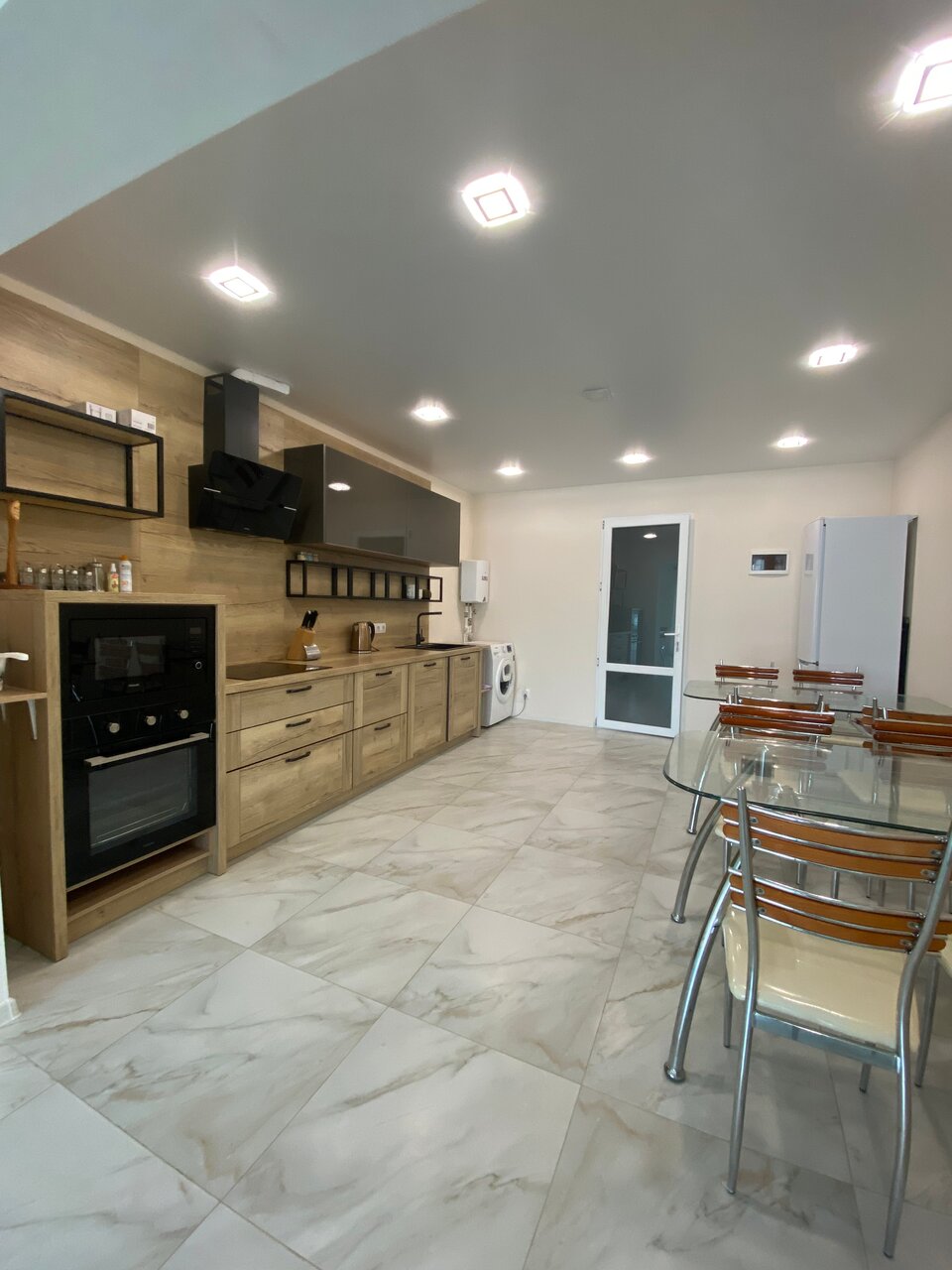 - Общая кухня с современной техникой (духовка, посудомойка, стиральная машина).