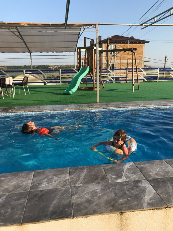 Лучшее место в Орловке! Новые номера — душевая кабина ( просторная, ничего не течет), туалетная комната на каждый номер, кондиционер, телевизор, мебель, белое постельное белье и полотенца! Общая новая, оборудованная кухня, мангальная зона. Бассейн во дворе ! Очень рекомендую, плюс цена