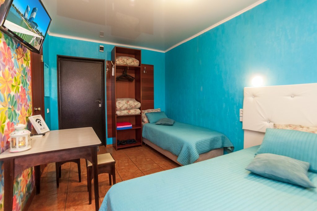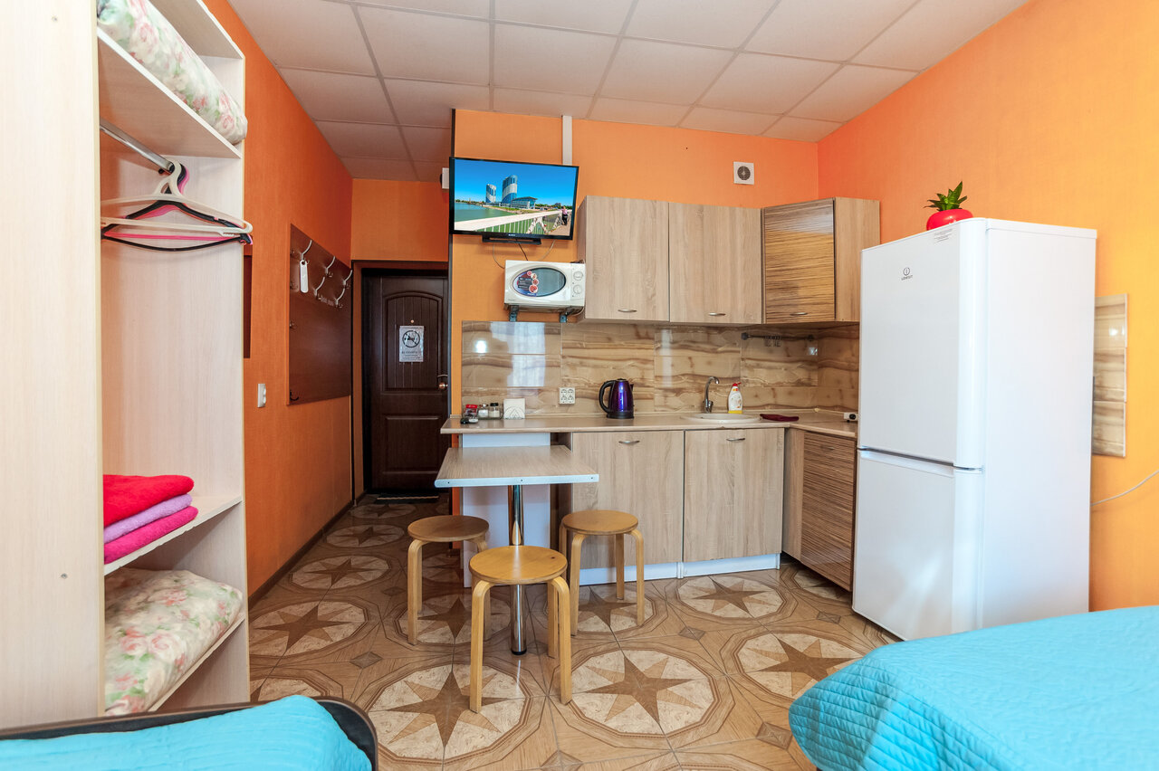 Услуги: — Номера от 1000 ₽/ночь (гипоаллергенные, для некурящих). — Бесплатная парковка, велопарковка, прокат авто. — Проживание с животными (платно). — Консьерж-сервис, трансфер, камера хранения. — Кухонная техника (чайник, микроволновка, плита), посуда, фен, утюг. — Бесплатный интернет, телевизор, круглосуточная стойка регистрации.