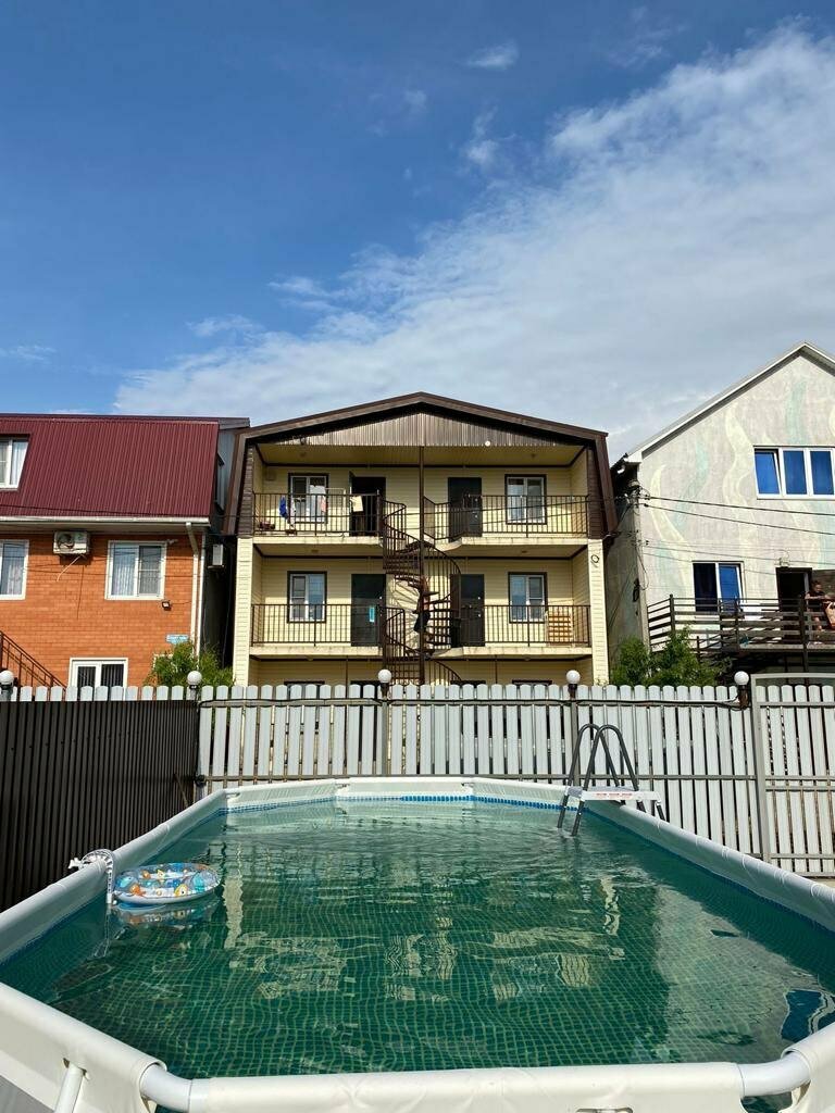 Отдыхали с семьёй с 22.07 по 28.07.2023 г. Снимали 4 х местный номер, номер шикарный. Есть всё, просто всё, вплоть до мелочей. Комната просторная, кухня в номере это большой плюс когда едишь с детьми., ванная комната чистая, есть полотенца на 4 х, посуда, утюг, гладильная доска, телевизор, кондиционер.Есть большой бассейн, детская площадка, зона отдыха для шашлыка От моря 5 минут, магазинов полно. Хозяева хорошие, общительные, доброжелательные. Рекомендую на все