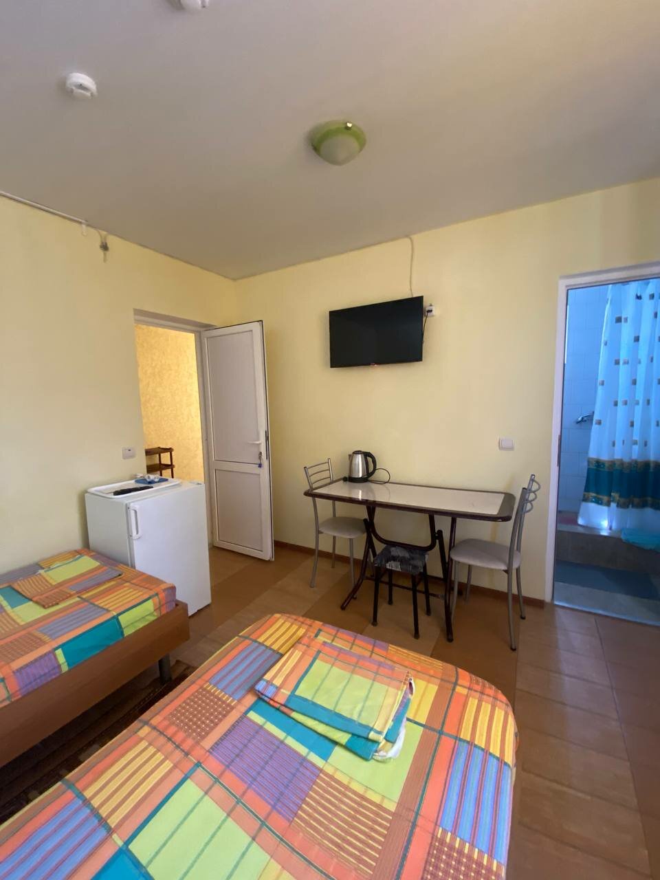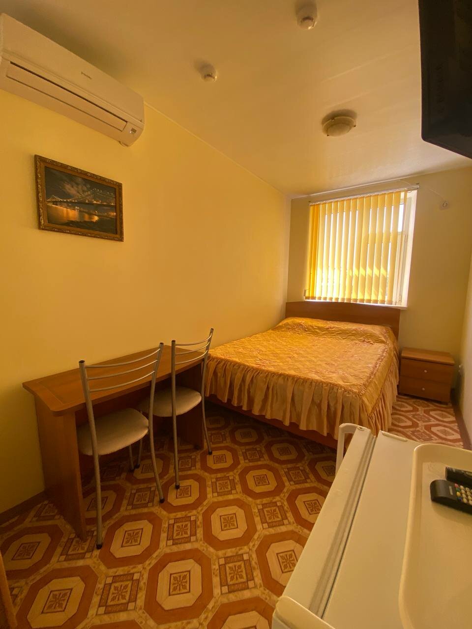 - Кондиционер, холодильник, телевизор, шкаф, стол, стулья, санузел в номере.