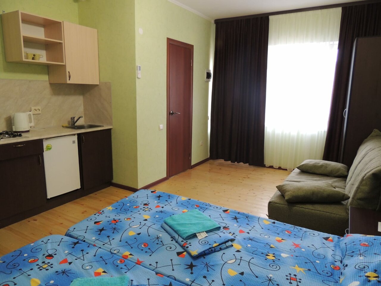 Ездили семьёй (двое взрослых и два ребёнка) на 3 дня. Выбрали двухкомнатный номер с кухней. Всё очень довольны. Комфортные помещения, везде чисто. В ванной комнате полотенца для ног и тела на каждого постояльца, рулон бумаги тоже входит в комплект. Небольшая кухня с тарелками и столовыми приборами. Т.е приезжаете и ниочем не заморачиваетесь. До моря где то около 200 метров. Вокруг много столовых и магазинов. В общем всем рекомендую останавливаться здесь на отдых. Цена за сутки вышла 3500 рублей.