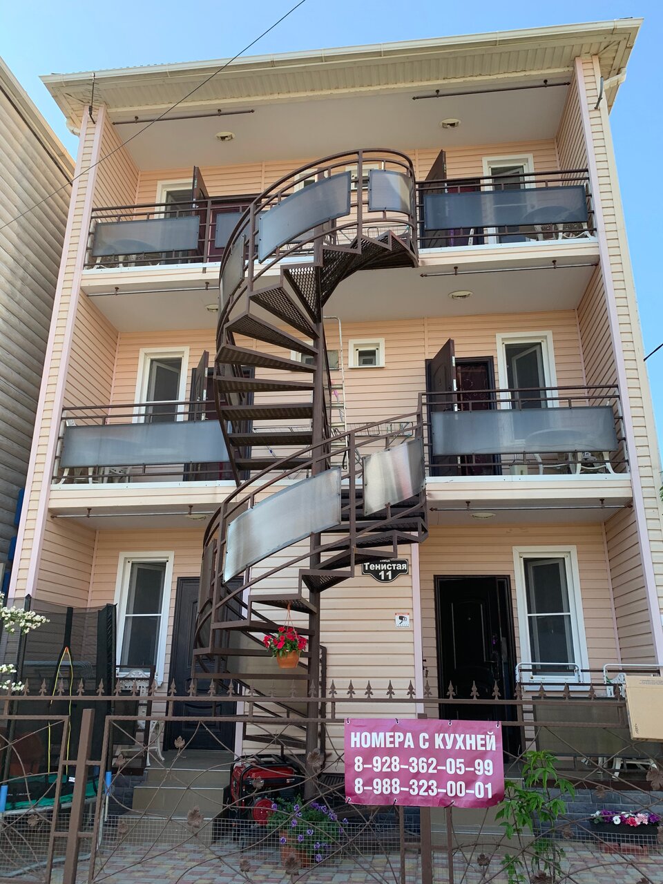 Отдыхали семьёй 5 чел. Уютный двухкомнатный номер с кухней. На кухне все необходимое, вплоть до мультиварки. Балкон выходит на водотводной канал. Есть детская игровая зона, общее место отдыха, барбекю зона. До моря минут семь. Хозяева приветливые. Возможно вернёмся))