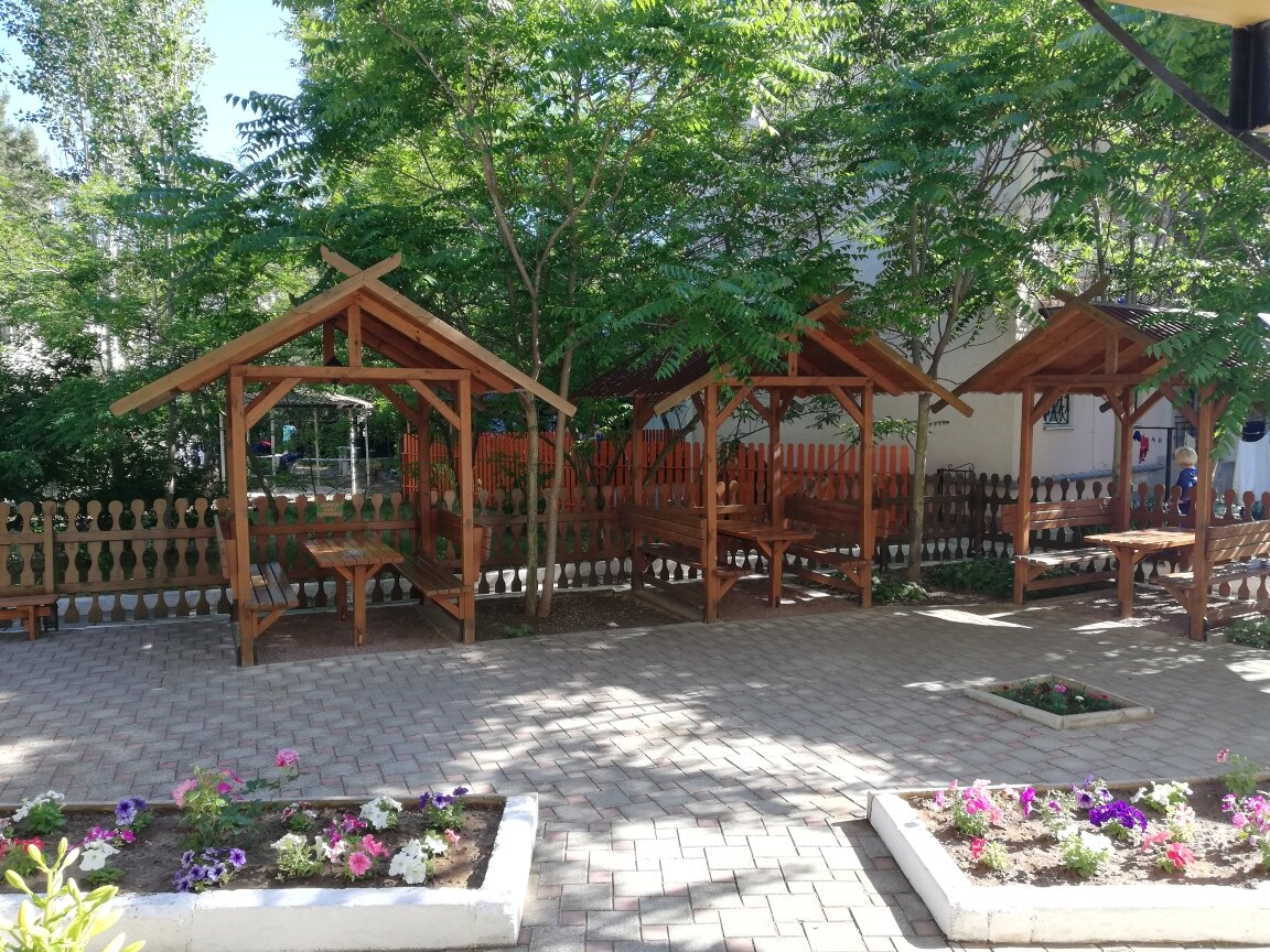 - Закрытая территория с местами для отдыха (беседки).