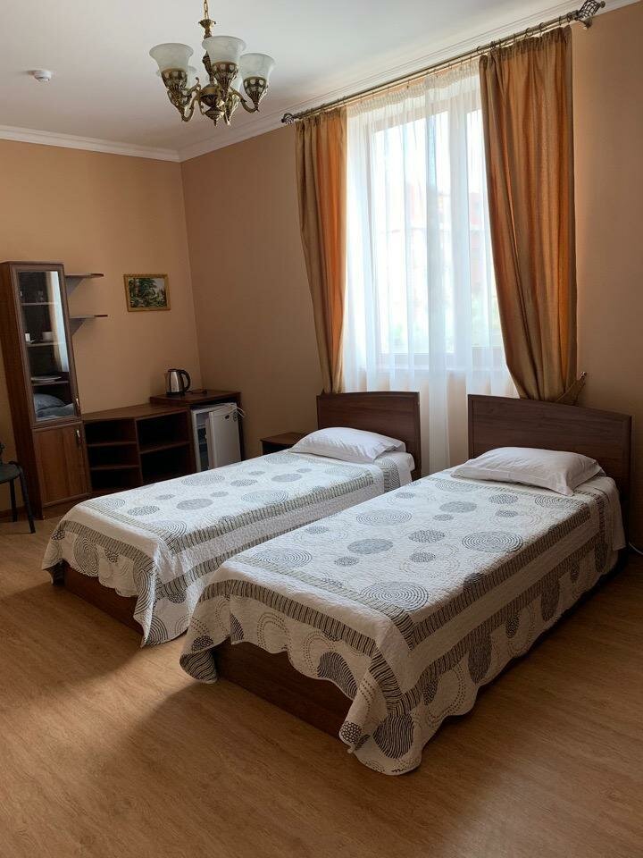 Номер состоит из комнаты 20 кв.м. и ванной комнаты ( душ, туалет). Мебель: две раздельные односпальные кровати, диван, прикроватные тумбочки, шкаф, тумба под ТВ, зеркало с полочкой, стулья. В каждом номере: телевизор с плоским экраном, кондицио...
