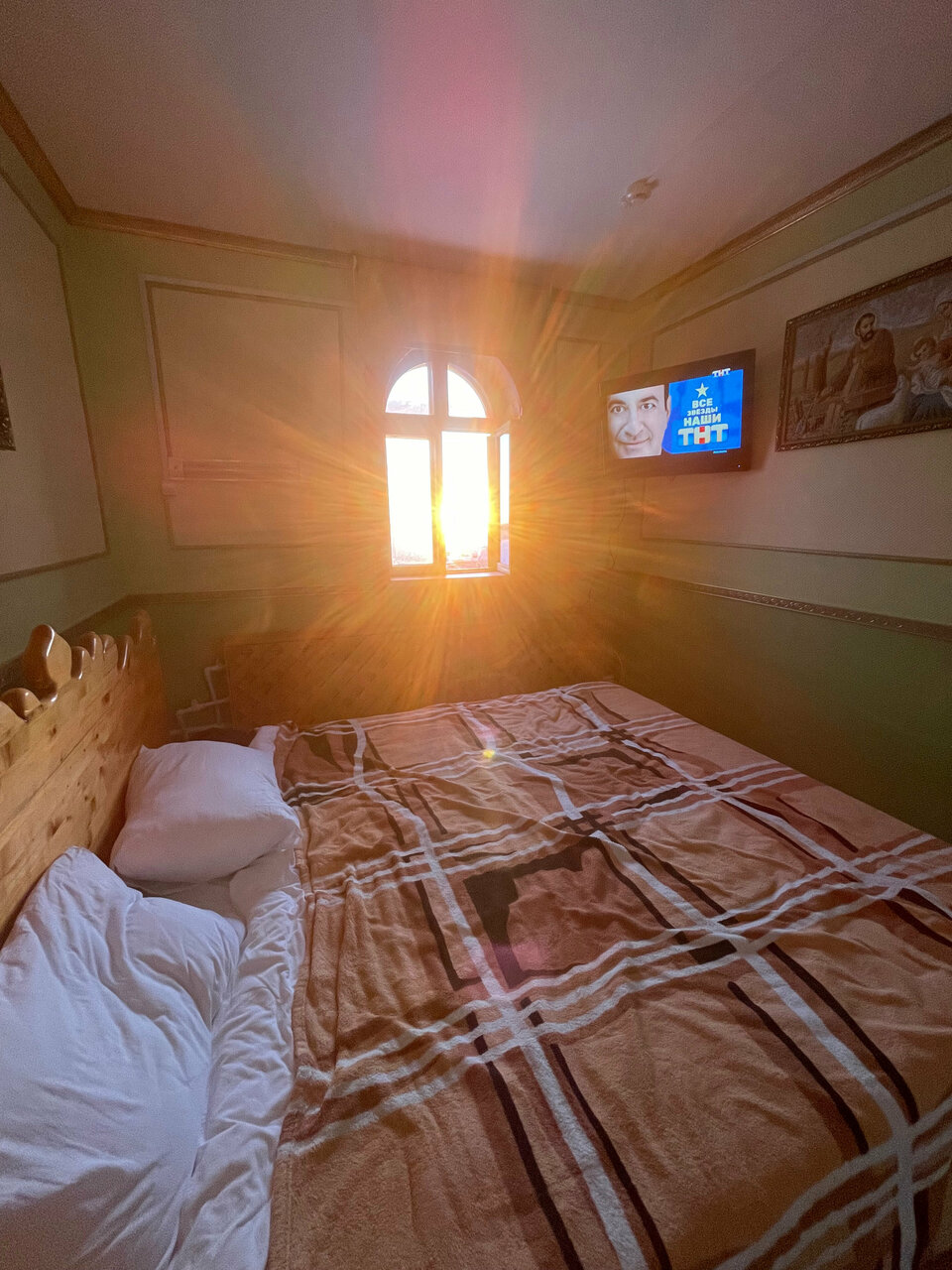 Просторный номер, но очень в плачевном состоянии. Бра не работают, светильники без колпаков, посуда разная и со сколами. В душевой нет ни мыла, ни геля, ни шампуня. Деревянные рамы плотно не закрываются. Обслуживание дистанционно. Из персонала ни кого нет. При заселении позвонил на номер телефона, назвали номер комнаты, сообщили что ключ в дверях и попросили перевести сумму на карту по номеру телефона. Выезд аналогичный. Позвонил, попросили ключ оставить в дверях, пожелали удачной дороги. Если проездом и необходимо просто провести ночь, то можно остановится, в принципе.