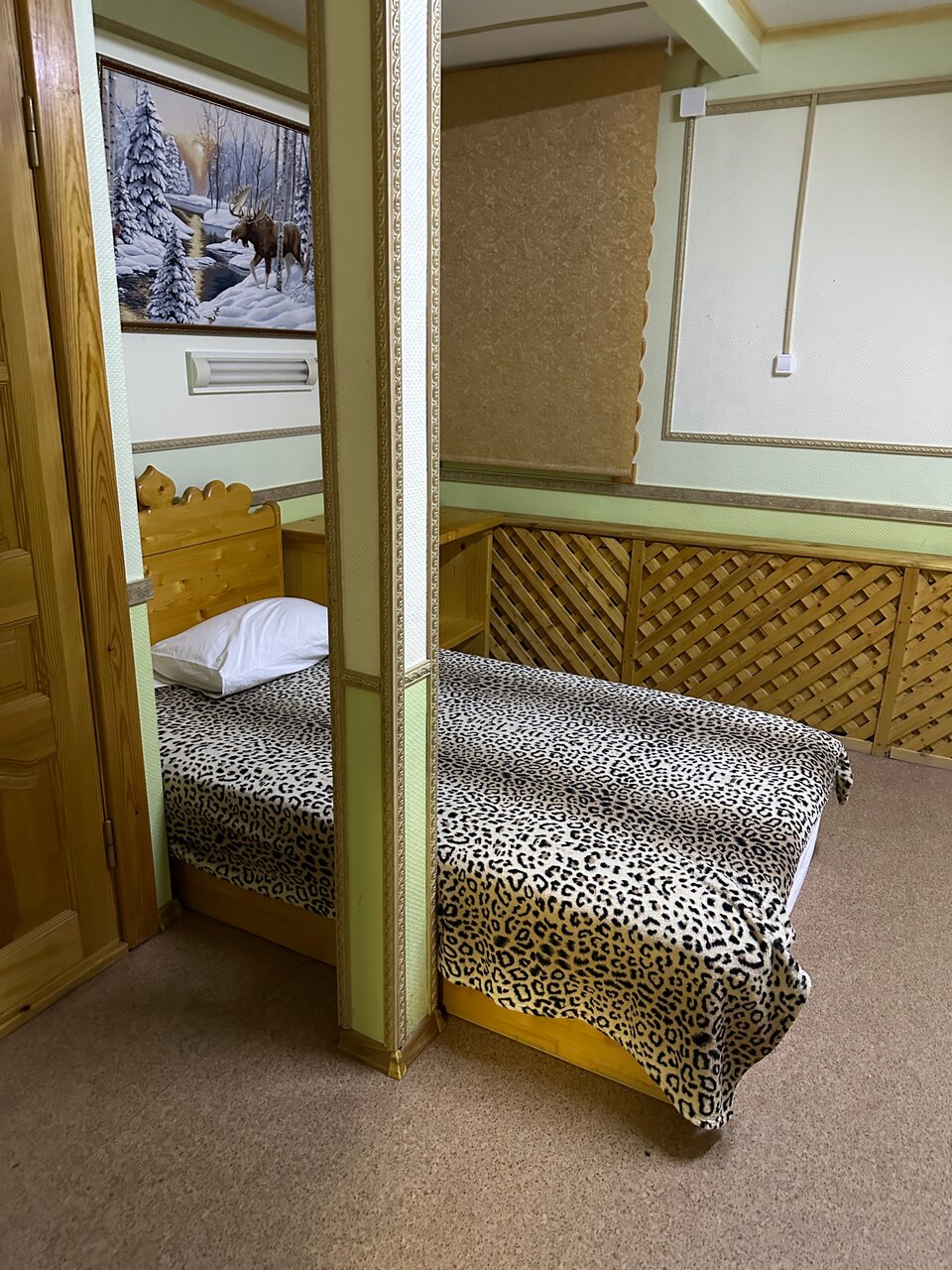 Полное отвращение. Всё старое обшарпанное, обслуга из серии ‘набрали по объявлению’. Вонь канализации, всё кривое. В санузле полотенцесушитель ледяной. Ни одного крючка для одежды. Единственный плюс — удобный матрац. Ну и баня хорошая.