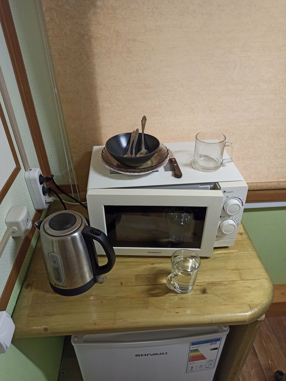 - В номере есть всё необходимое (посуда, холодильник, микроволновка, шкаф).