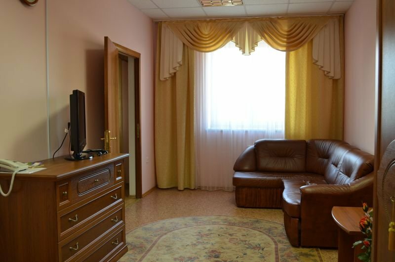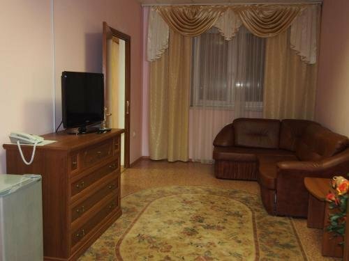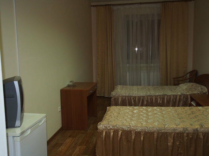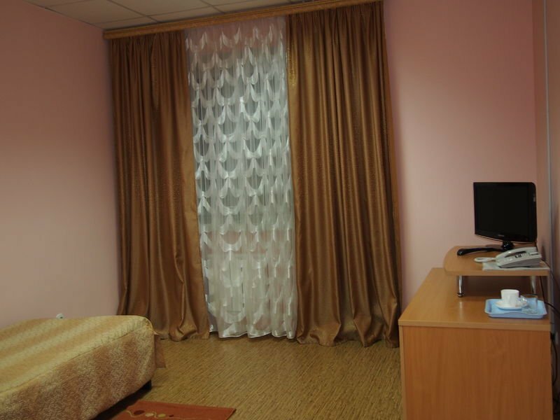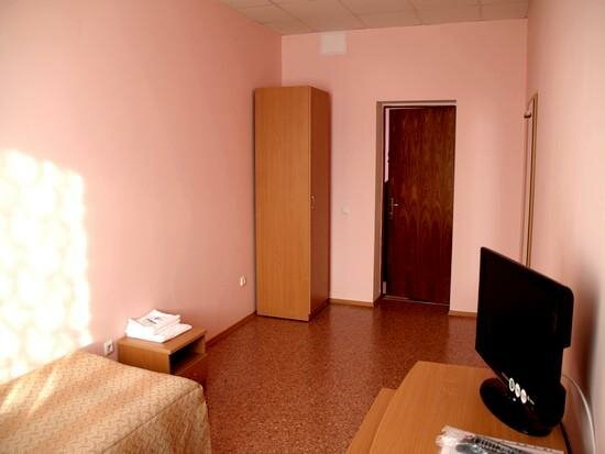 Это ужасно. Как зашла, в нос ударил резкий запах пенсионеров. Окна закрыты шурупами. Администратор не могла нас заселить, потому что ничего не понимала. Дверь входная железная сломана, приходится придерживать — иначе хлопать будет на всю гостиницу. Однажды не удержали, так нам администраторша обещала ‘ща как по шее надаю’. Считаю такое обращение с гостями неприемлимым. Обстановка в номерах — как в офисе спишь. Телевизор у нас был, но видимо для красоты — он не работал вообще. Душ и туалет отдельно. Тапочки и воду приобрести можно только за деньги. НЕ СОВЕРШАЙТЕ ОШИБКУ И НЕ ЗАСЕЛЯЙТЕСЬ СЮДА.